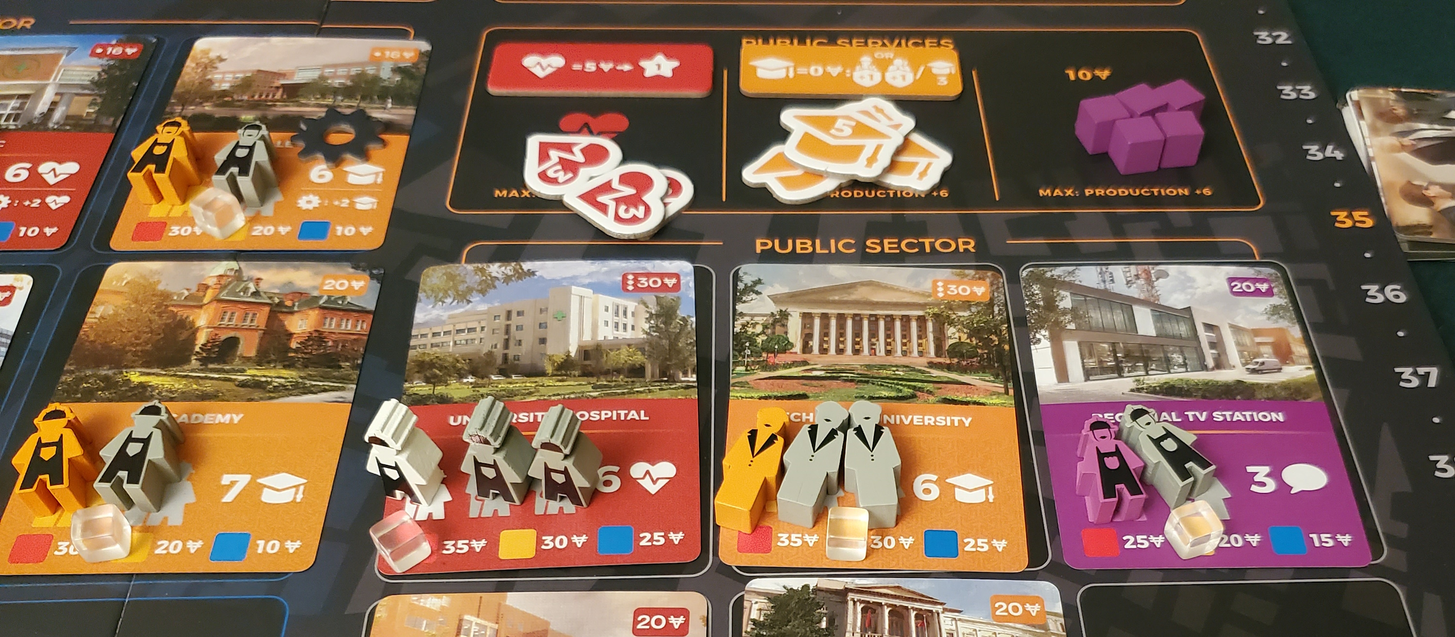 For instance, multiple sessions have resulted in a peculiar situation where the Working Class is absolutely stacked with cash while also suffering from crippling unemployment. Now, there’s a way to combat this. The Working Class can launch demonstrations when there are too many unemployed workers. This potentially robs the other factions of points if new jobs haven’t been provided by the end of the round. Except the Working Class likely has plenty of money, which they’re using to buy services and goods to increase their prosperity, so they don’t have a strong incentive to actually hold the demonstrations for more jobs. Their incentive, when you get right down to it, is to drain opposing points. An odd carrot indeed, breaking the game’s fourth wall and representing… what? Resentment? Jealousy? It seems like there could have been more tangible ways to depict the quality of living gap than an appeal to the scoring track. Meanwhile, all those unemployed workers incur neither penalty nor obligation. As an entity, the Working Class’s approach to its clients is all positive contribution, no responsibility.