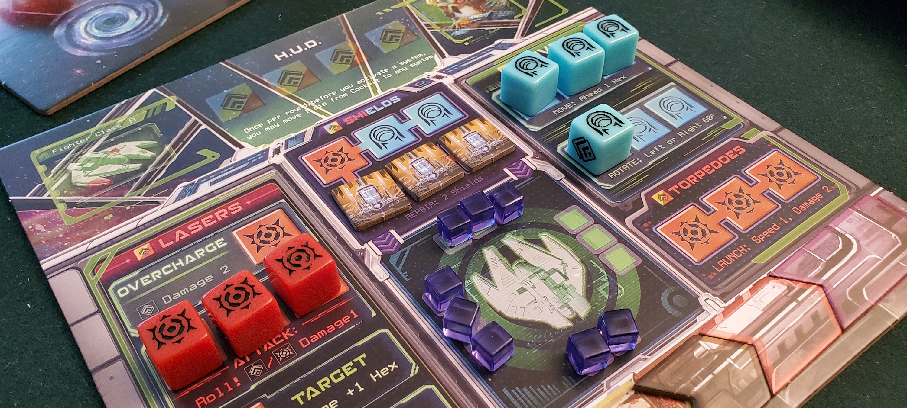 Star Fighters sits in the second category. There are precious few decisions to be made at any given moment. As evidence, consider the dice. These are simple little things. Most of their sides are blank. Blanks can’t be assigned at all. The other sides dictate whether they can be placed. Along with their color, dice either slot into a system or they don’t. If you have a blue die, it can be used to move your ship forward or rotate your ship. That’s almost the entirety of it. A red die can be used to fire lasers or torpedoes. On rare occasions, a mix of blues and reds can be used to recharge your shields. This isn’t often a good move for no other reason than because it requires more bandwidth. More often, an attack can be avoided by darting away from it.