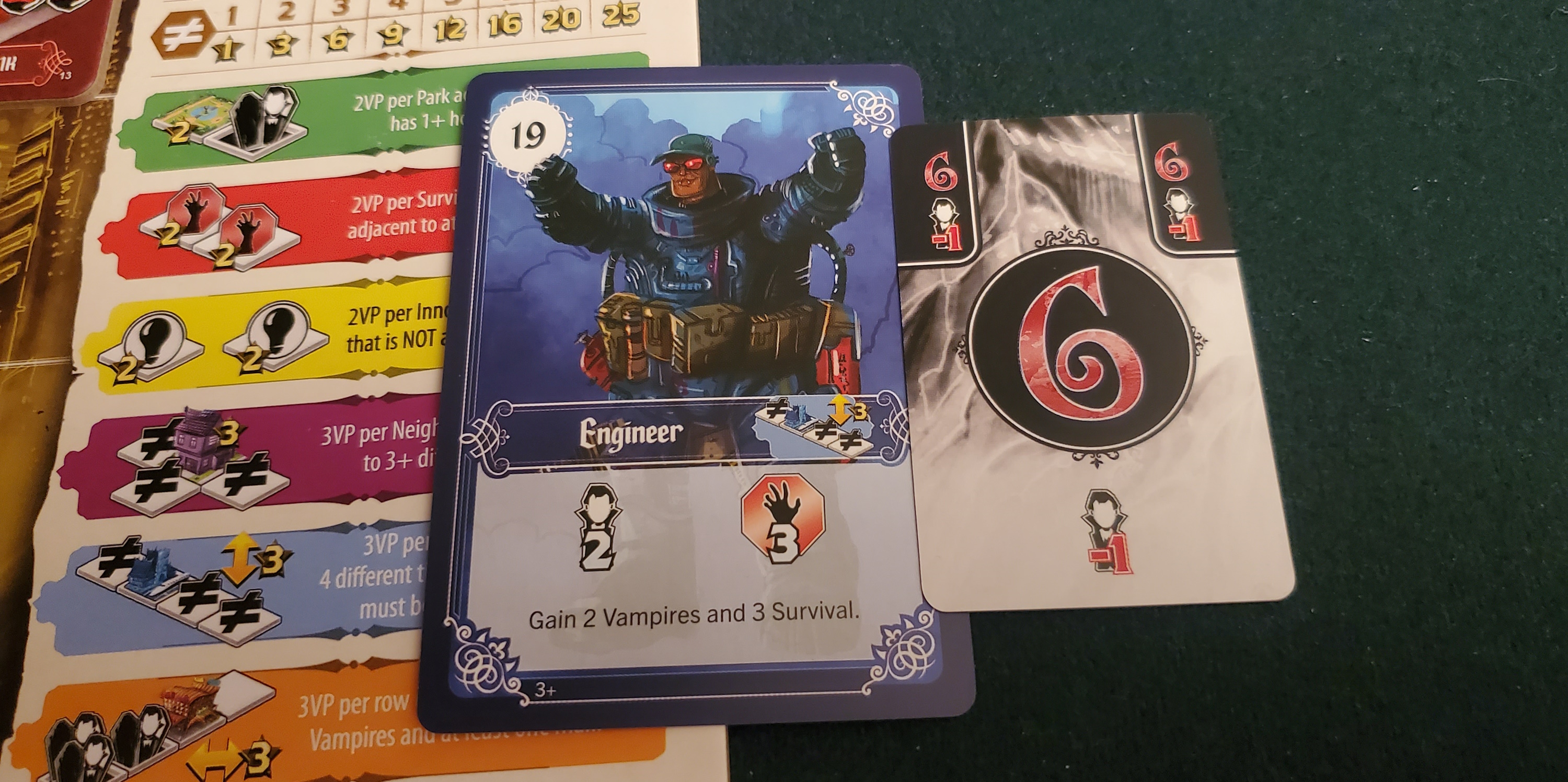 The final function of those employees is scoring. After a few unburdened opening rounds, SiliconVania ramps up its intensity by requiring everybody to dedicate one of their employees to their scoring pile. There are seven types in all, each connected to a different flavor of tile. Although there’s some particularity to how many of a type you can play and how many points each one can score, this is where most of your final tally will be gained. The categories read like a checklist of tile-laying best hits. Metro stations score when they’re in a column with three different tiles; malls hit rows but require a certain number of housed vampires. Neighborhoods like being adjacent to variety, while plopping mausoleums next to blood banks will lessen the commute for hangry vampires, their blood mugs declaring “NOT AN EVENING PERSON” or somesuch.