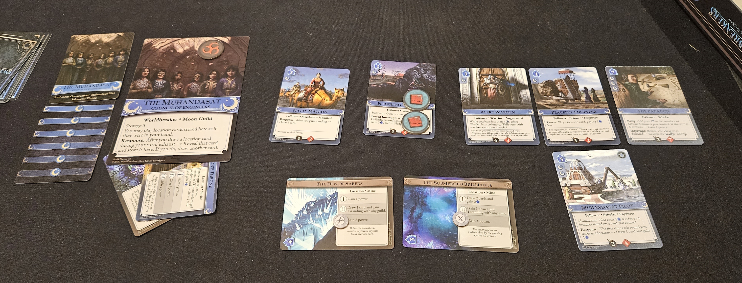 For example, Ruknuddin Khurshah, the worldbreaker leader of the Order of Assassins, loves to deploy single attackers. His deck is full of specialists who only reveal their full potential when fighting solo, dealing unblockable wounds or bringing home crucial resources. The Muhandasat, a council of six genius engineers, would rather never attack at all, instead forming internal combos that resolve at the end of the round to build their power.