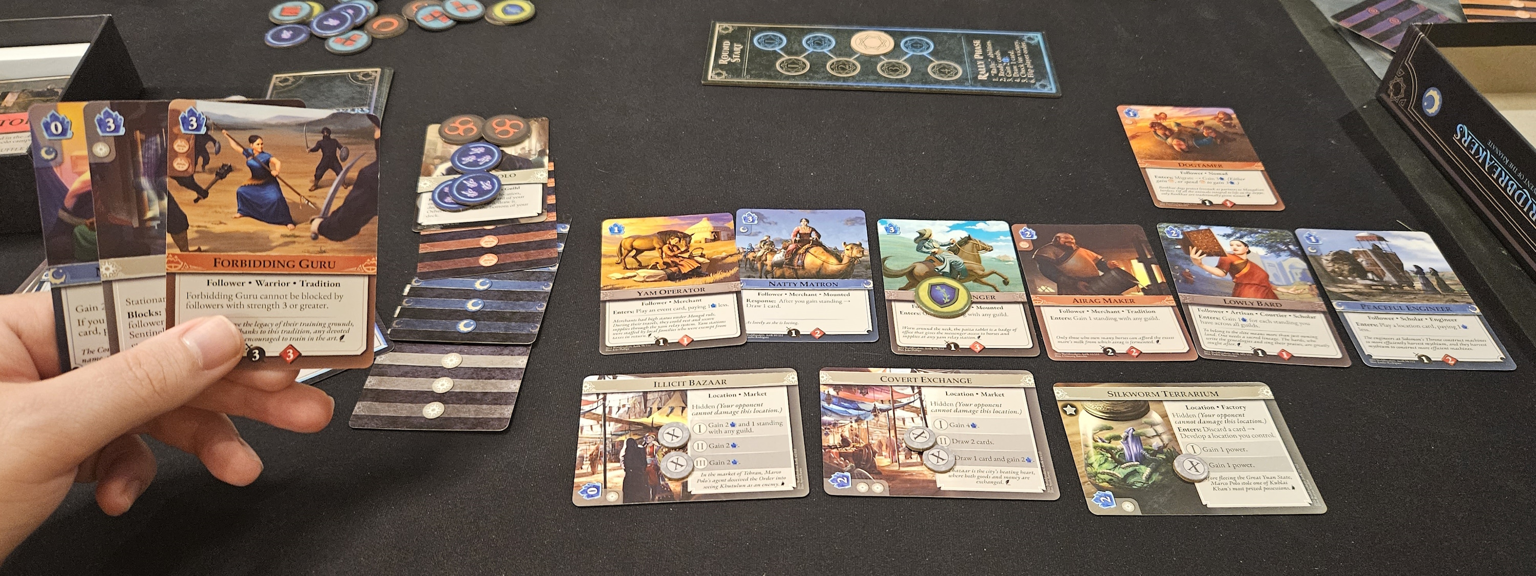 Power, by the way, is the game’s win condition. The entire duel is pitched as a race to ten power tokens. There are only a few ways to gain the stuff, but they’re nicely distinguished by guild. Khutulun leans into the whole Golden Horde angle. Everyone earns power when their attacks breach past defenders, but her troops sometimes gain power simply by showing up on the field of battle. Again, momentum is her watchword, and it’s common to see her setting the game timer by earning a trickle of power tokens each round. Marco Polo has the steady income of his camps, the Muhandasat pull their keyword tricks each round, and the Order of Assassins assassinates people. They do so love their branding.