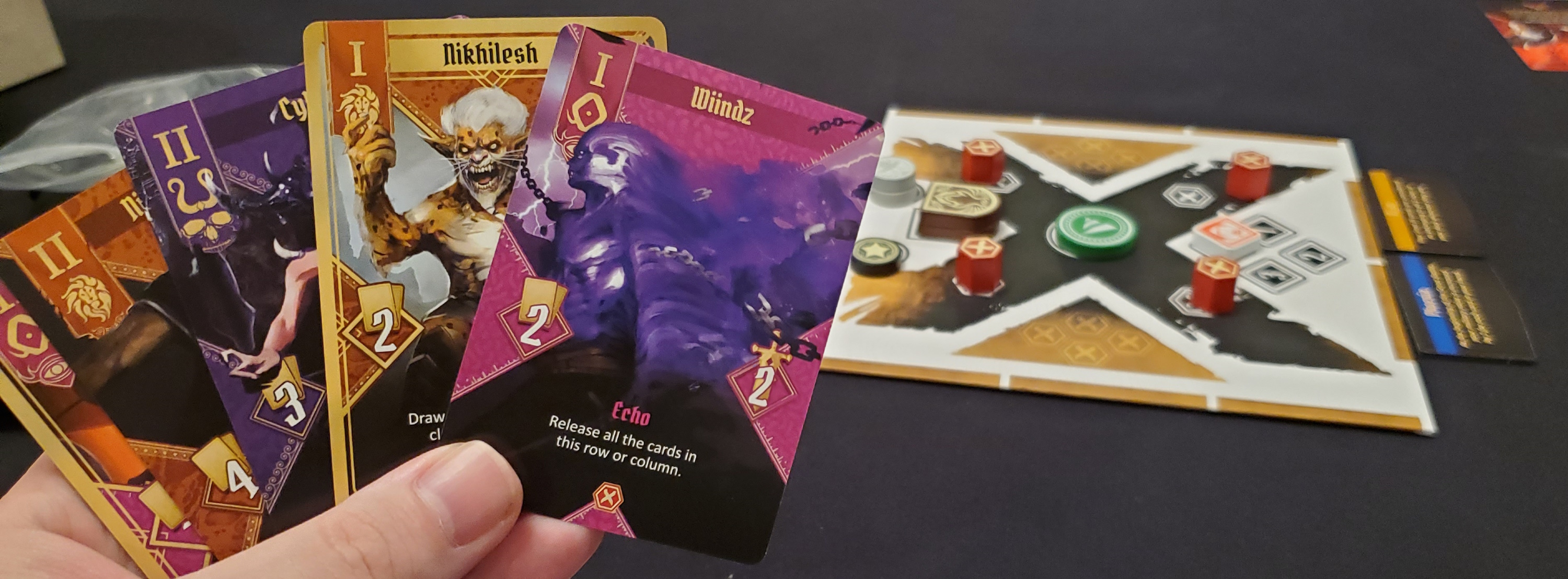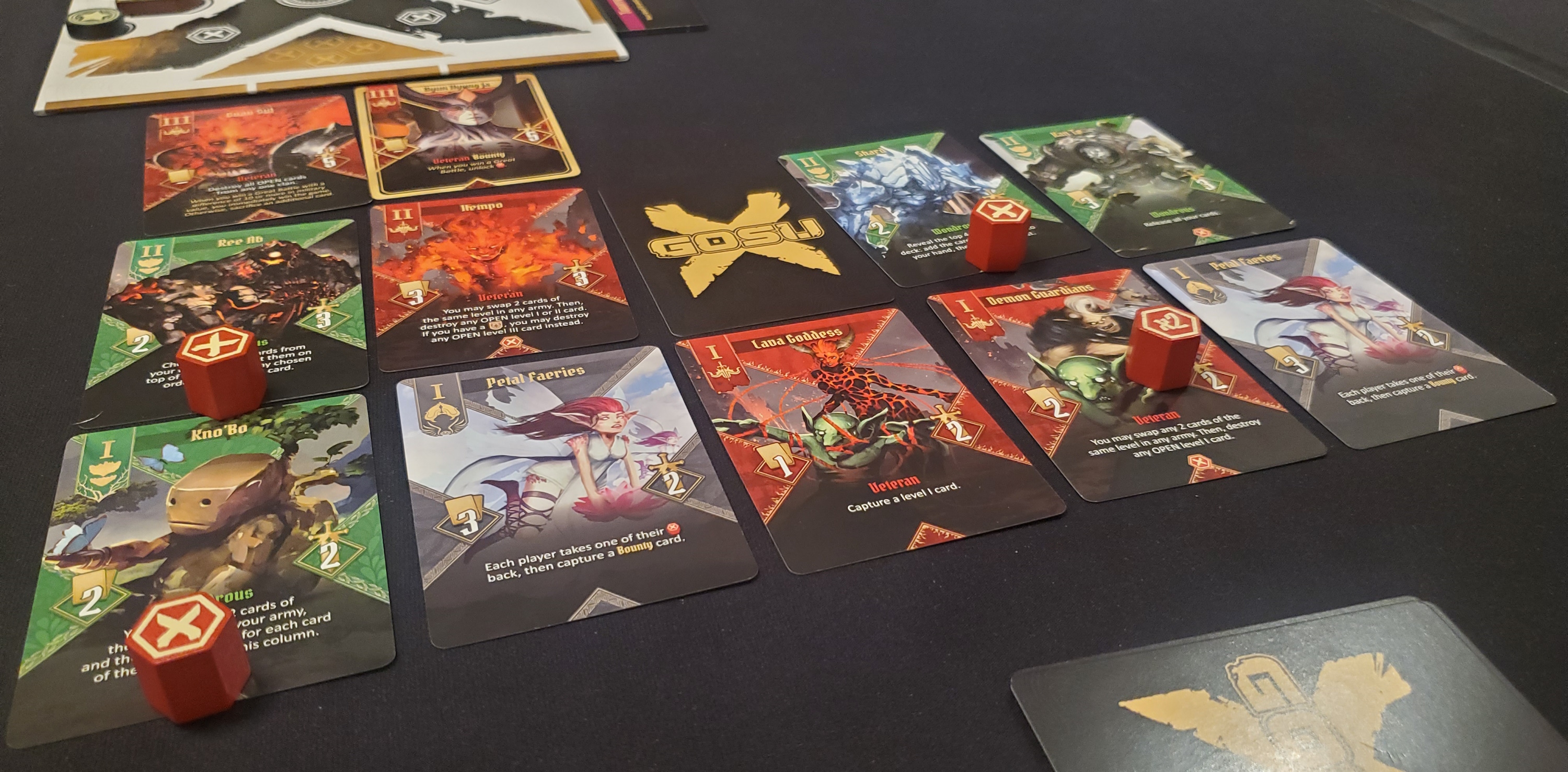 There’s a lot going on here, and it’s easily the best part of Gosu X — although it defies what we’ve come to expect from dueling games. Interaction between players is limited. To be sure, there are plenty of ways to reach out and touch one another. It’s just that every point of interaction comes with some hefty caveats. Sometimes cards will be destroyed, removing them from a player’s army altogether. But only “open” cards can be destroyed, those that aren’t propping up anything above or to the right of them, preventing attacks from wreaking havoc too haphazardly. Some effects permit draws or force discards, but these are largely made at the discretion of the player they affect rather than being stolen at random from their hand. You also have access to special action tokens that can trigger your troops’ abilities, but again, these are options you deploy to your own tableau. Very nearly all of your attention is reserved for your own army. It isn’t multiplayer solitaire, but it’s closer than, say, Summoner Wars.
