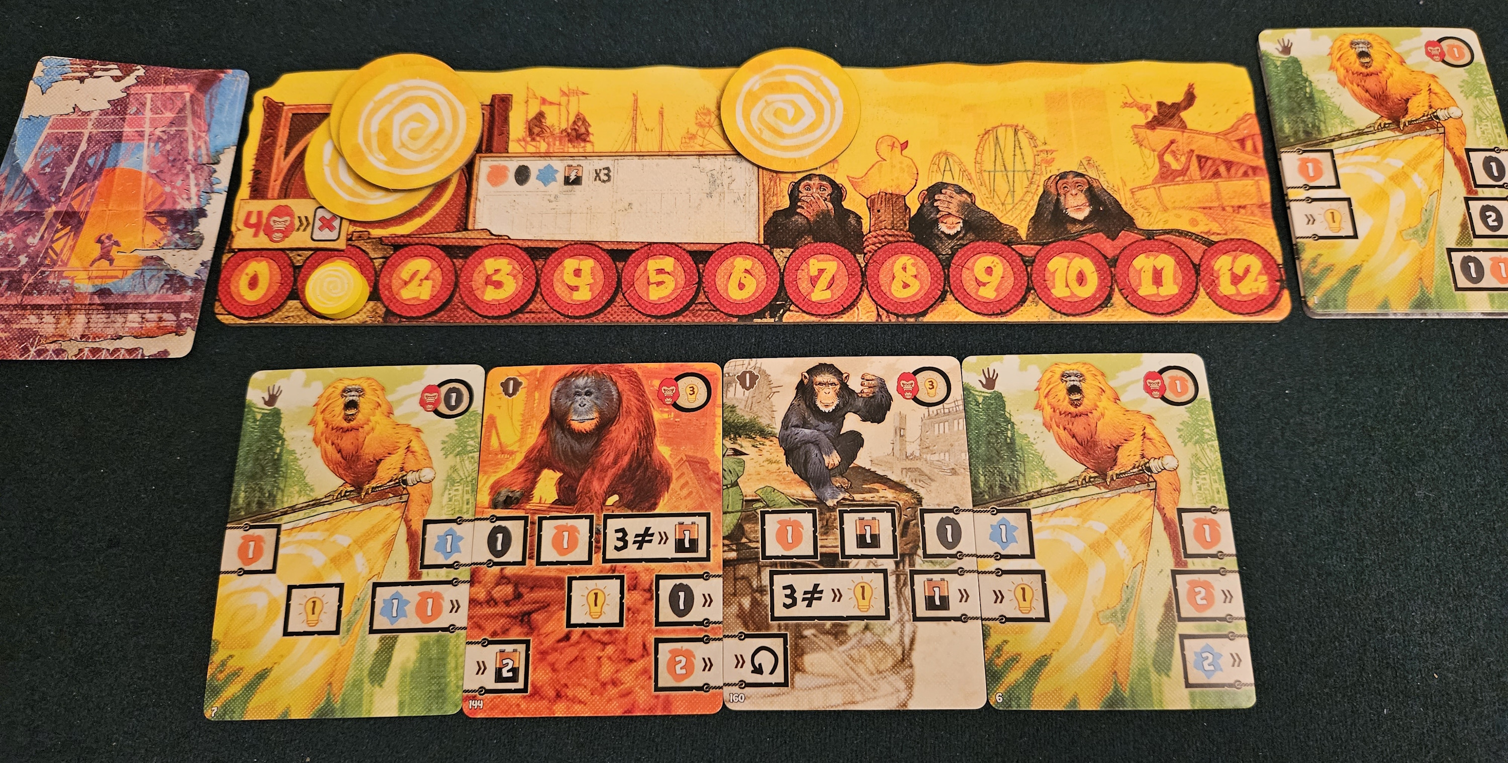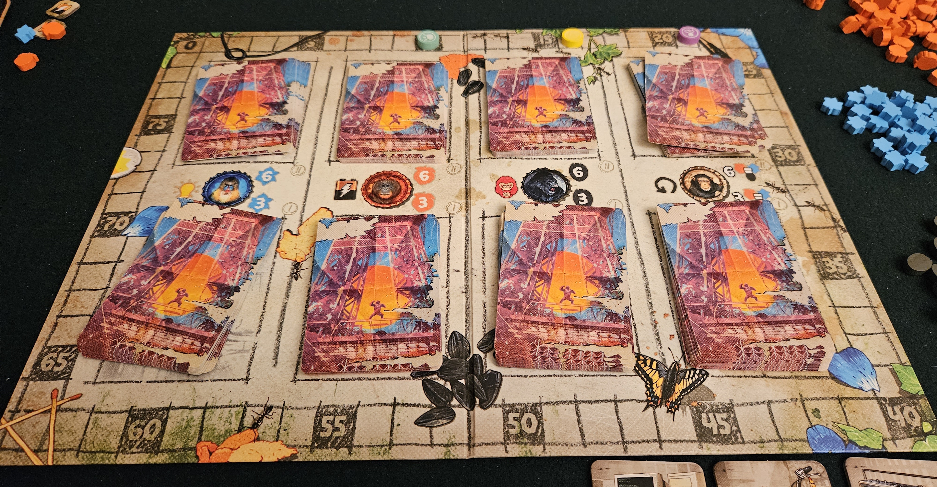 This is why not. Right from the get-go, After Us doesn’t propose a planet of the apes so much as a snoozefest of the apes. The central conceit is that your cards are assembled side by side, action boxes aligning to gather resources or create simple triggers. It’s a perfectly fine idea, although the execution is so bland that it’s like visiting the zoo to see the monkey house, except it’s one of those days when all the exhibits are mysteriously closed. All that lingers is the smell. Boxes are indeed arranged, but there’s so little spark running through this game’s head that there’s rarely anything resembling a decision to be made. Instead, one is often best served by simply aligning as many box edges as possible and hoping they provide the best bonuses. Quantity over quality. All the thrills of dropping a rectangular block through a rectangle-shaped hole.