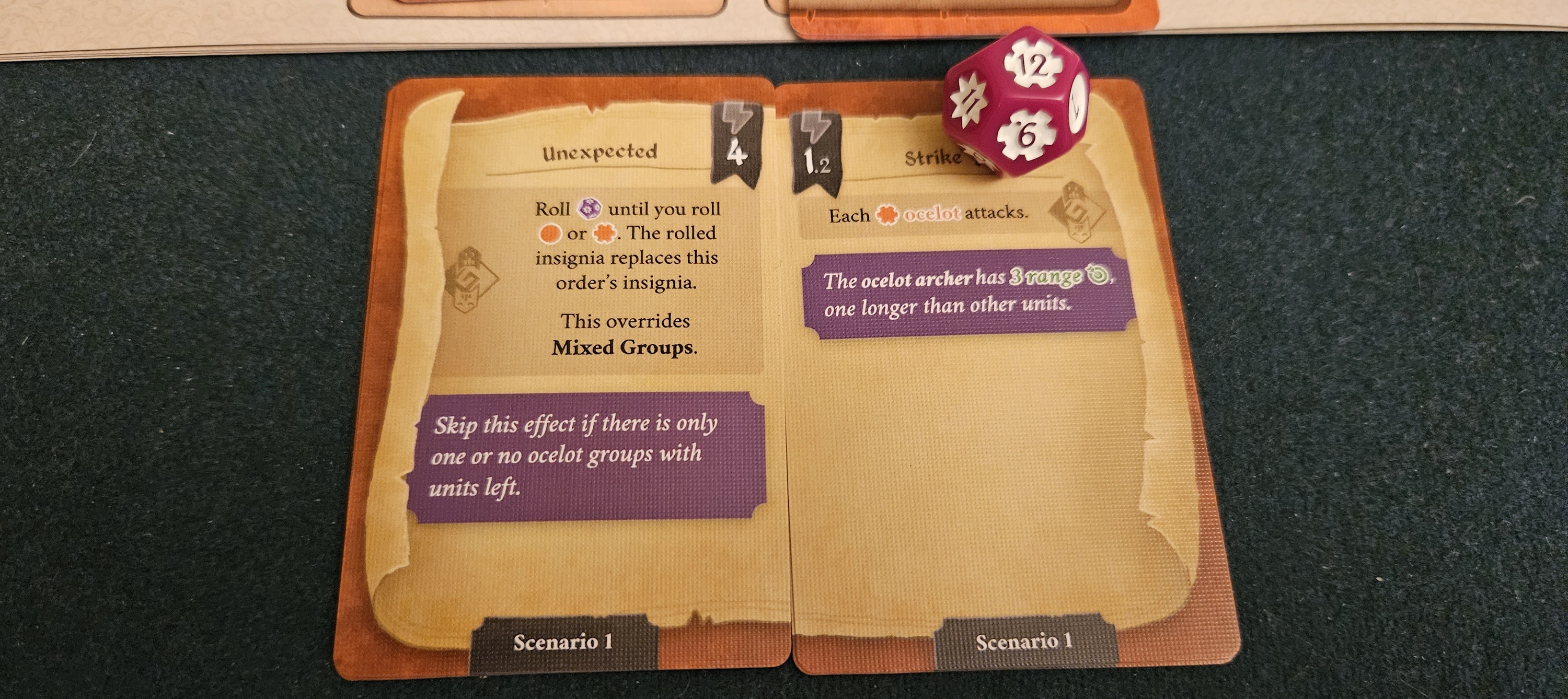 To be clear, this isn’t a simple task. For one thing, we’re only looking at half of the round’s orders. It’s entirely possible that we’ll need to intervene with the ocelots as well. I’m also presupposing that we actually know what the macaws are up to, which involves moving into position, surveying their orders, and still having action cards left over to tinker with the outcome. To wield such insights into the workings of an army on the field, we might need to get creative, bouncing cards between characters and making tactical concessions.