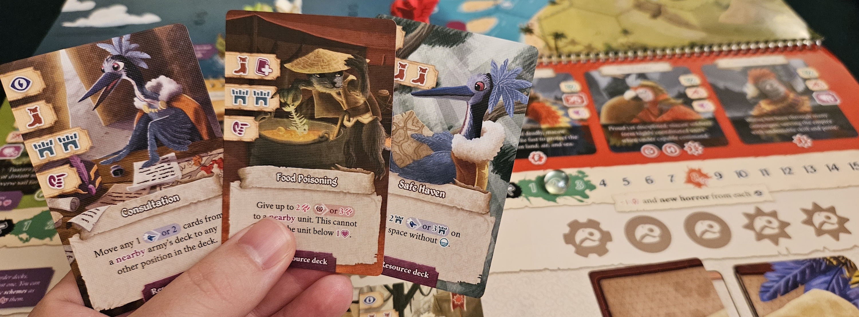 “Tactical concessions.” What a euphemism. As horrible as it is to say, we might want some of those invading macaws to get thrashed crossing the river, because nothing craters morale quite like hearing that an entire cohort has been wiped off the map. But a unit’s death is never something you permit lightly. Peacemakers makes it clear that these are atrocities, forcing you to draw a “horror” every time a unit is totally destroyed. These traumatize your heroes, sometimes by making them unwelcome in an army that now regards them as a spy, other times by inflicting panic attacks or deep-seated anxieties. Peacemakers is an uncommonly honest game in this regard, demonstrating the toll of violence on belligerents and noncombatants alike.