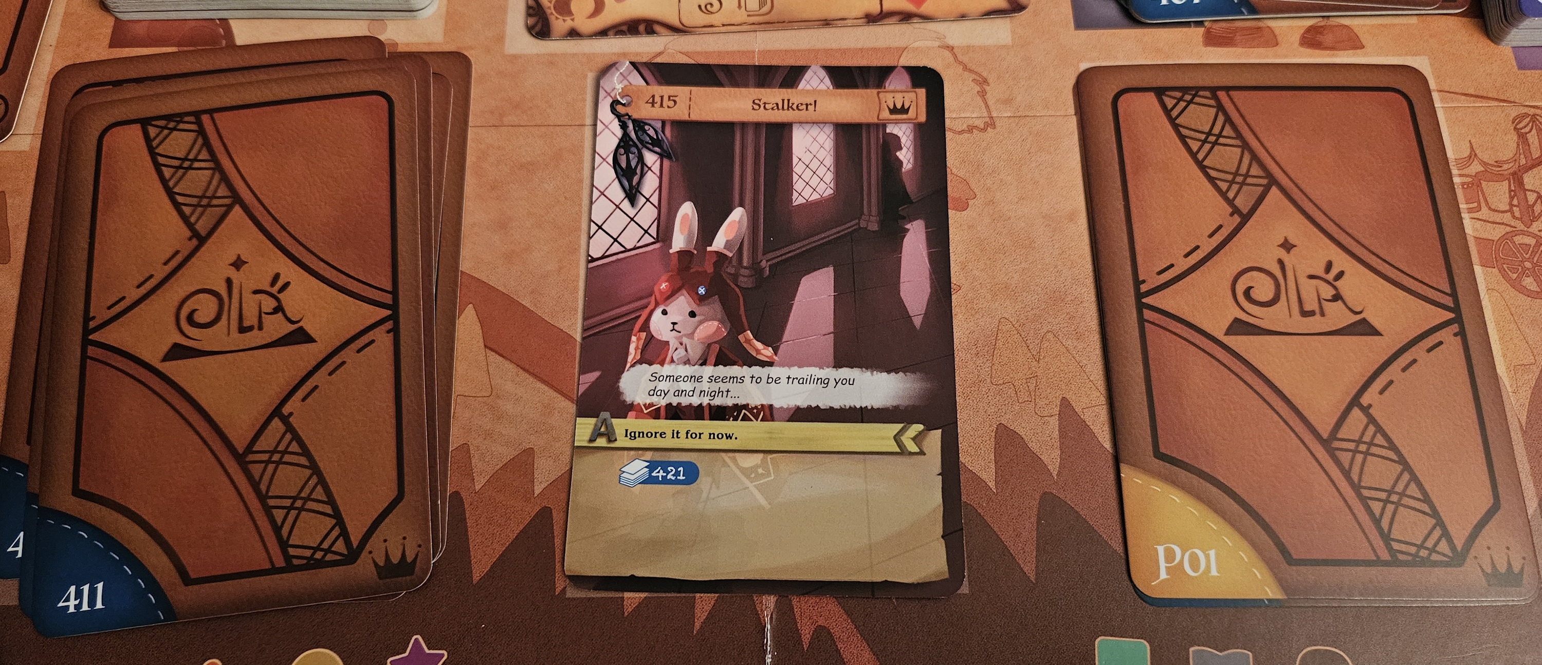 The journey itself is brief, much the way a tooth extraction might be brief. This isn’t because the game is bad. Each chapter, of which there are six, introduces new concepts. There’s an awkwardness between the rulebook and the actual game, with one page reserving a concept for “the second chapter.” This left me confounded for a portion of chapter one, which only qualifies as the second chapter if you count the skippable prologue as a chapter; needless to say, my overly literal rule-reading brain hadn’t made that jump. Never mind. Soon I was cruising through the story. The design begs to be cruised through. There are new ideas aplenty. Where one chapter is all about painstakingly balancing resources and making combat rolls, the next will introduce spelunking through a modular map. These aren’t spoilers as such; one of the first things you’ll see upon opening the box is a pair of dice sporting shields and an X-eyed rabbit, and the map tiles are right there on the punchboards. Rather than hiding its goodies within sealed envelopes and boxes, Eila and Something Shiny tantalizes by holding its breadcrumbs right under your nose. As befits that promise, I finished the entire thing in two sittings.