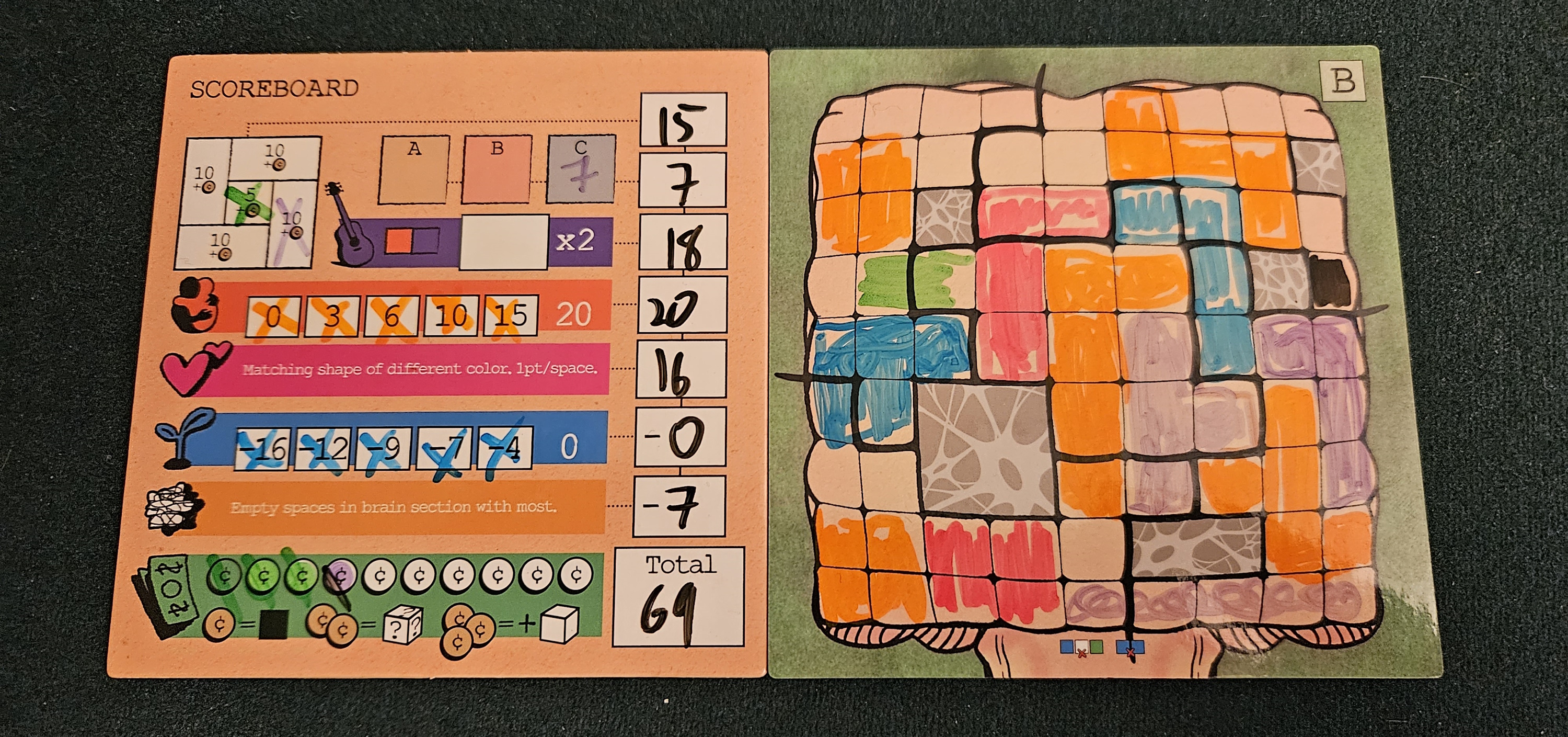 So you try to squeeze it all in. Here each pursuit is a polyomino, scattered by a roll of dice to conform to one of five colors. These each have their own criteria for scoring, all with a nice sense of identity. Purple shapes represent hobbies, but because hobbies are best shared with friends — how’s that for an assumption? — they only score when placed adjacent to orange shapes. Friends are their own reward, in the game’s thinking. There’s also self-care, represented by the most melancholy color, which will subtract a chunk of points at game’s end unless you’ve allowed some therapy into each broad segment of your life. There’s something nifty about this one: with the proper placement, you can get away with only two or three blue shapes. Doing your therapist’s homework really does pay off.