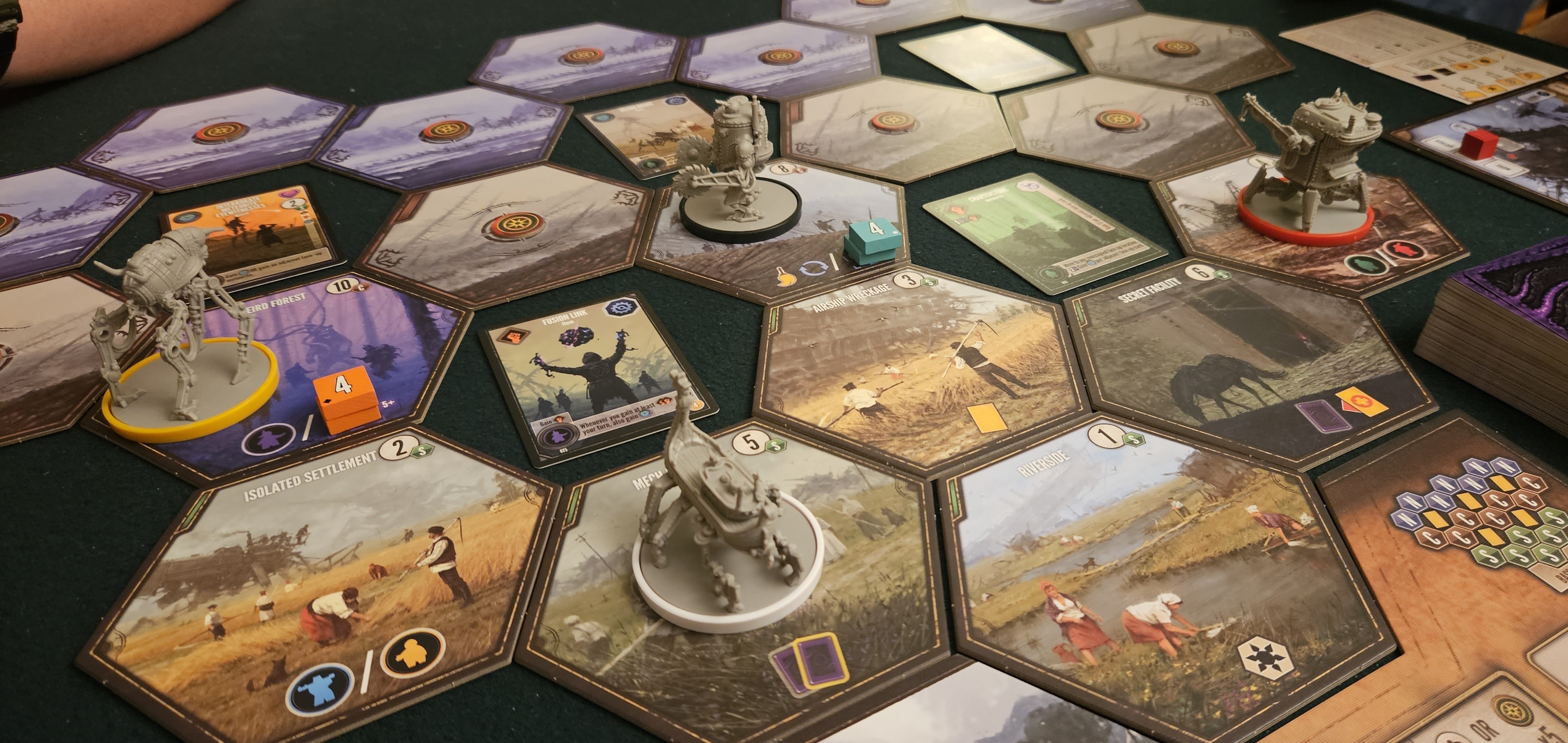 It almost goes without saying that the presentation is immaculate. This applies to the game’s components and illustrations, which are handled with Stegmaier’s usual Midas touch, but also owes mention to the game’s subtler elements. The arrangement of the map, for example, with its already chilly tones draining to harsh and inhospitable whites and alien violets. Or the fragmentary nature of the landscape, pockmarked by a five-card offer that feels disorienting, even wrong. Something has gone terribly awry in this place, much the way something went terribly awry in our own timeline, when in 1908 a meteor airburst set off a twelve-megaton explosion that toppled two thousand square kilometers of trees like dominoes. Unfortunately for the inhabitants of Rozalski’s world, something crawled free of the meteor and has set to work twisting the countryside and people to better suit its needs.