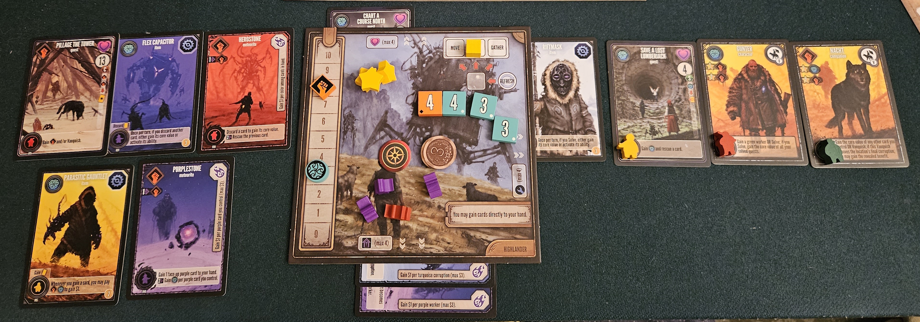 I think the “narrative decisions” are the quests themselves. One can solve all the quests they need to maximize their points simply by helping the folks in the southern area, but thinking of all quests as equal overlooks the fact that the higher-latitude quests offer more rewards, including more cards, more money, more card tucks and more uses of of on-table card abilities and location benefits. The choice to focus on helping the people in the south is still glorious, in the end, but the choice (and ability) to expend more power and cunning in the north could mean accomplishing more overall. It’s like choosing the left side of a Scythe encounter over the right side, but by trading in physical and mental capacity, rather than popularity.