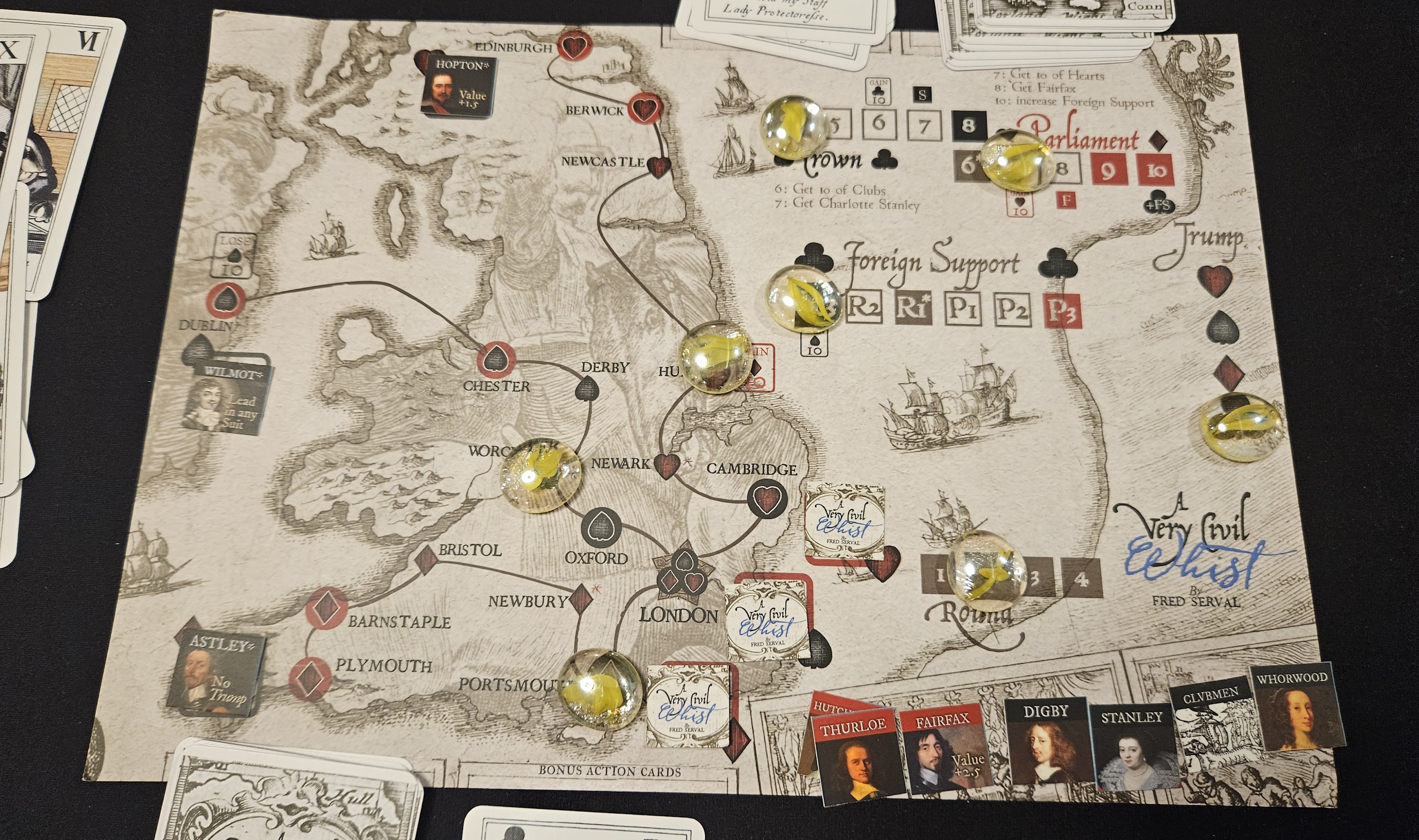 Instead, Serval has produced something closer to a history of anxiety. There is simply never enough room to get everything done. At any given time, players are fighting multiple stubborn campaigns, building their bases of support, courting foreign influence, and on occasion spending a turn on a special action. The preparation phase of each round, in which both sides evaluate their hands, draft cards, assign generals, and select the trump suit may well consume as many minutes as the campaign phase itself. Its pacing is furious. Sometimes Roundheads and Cavaliers will bash away at one another, keeping the progress of a campaign stagnant for multiple rounds, only for one side to slip through and turn the tide of the entire session.