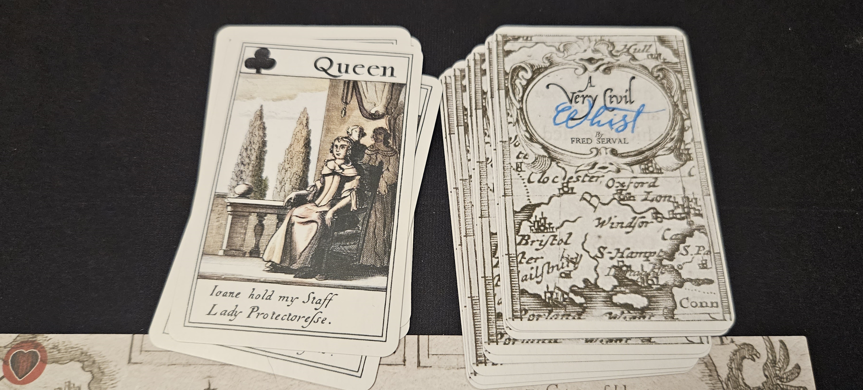 The approximation to history is borne out by Fred’s choice of a Restoration deck of cards mocking the Cromwellian Commonwealth
