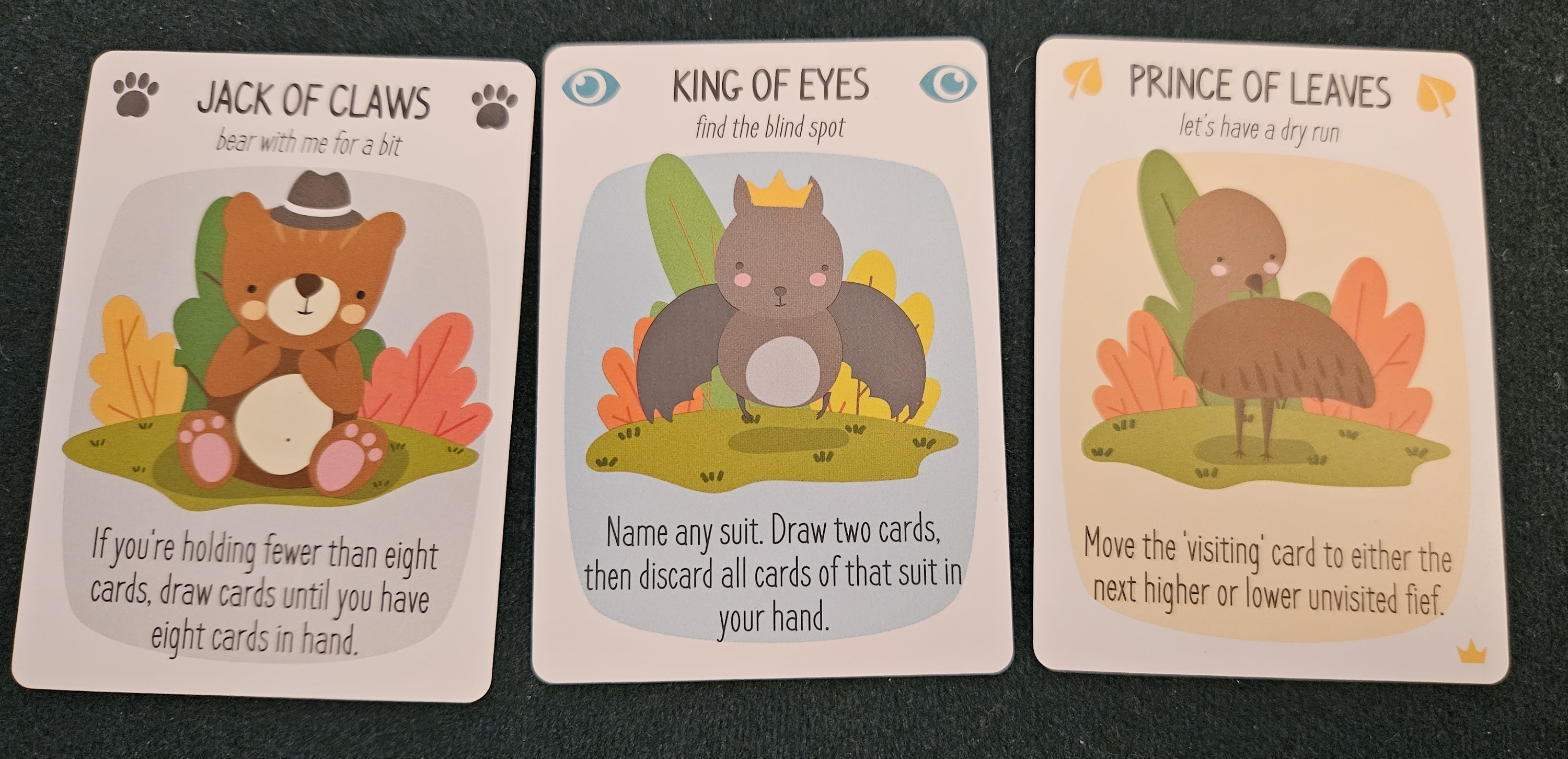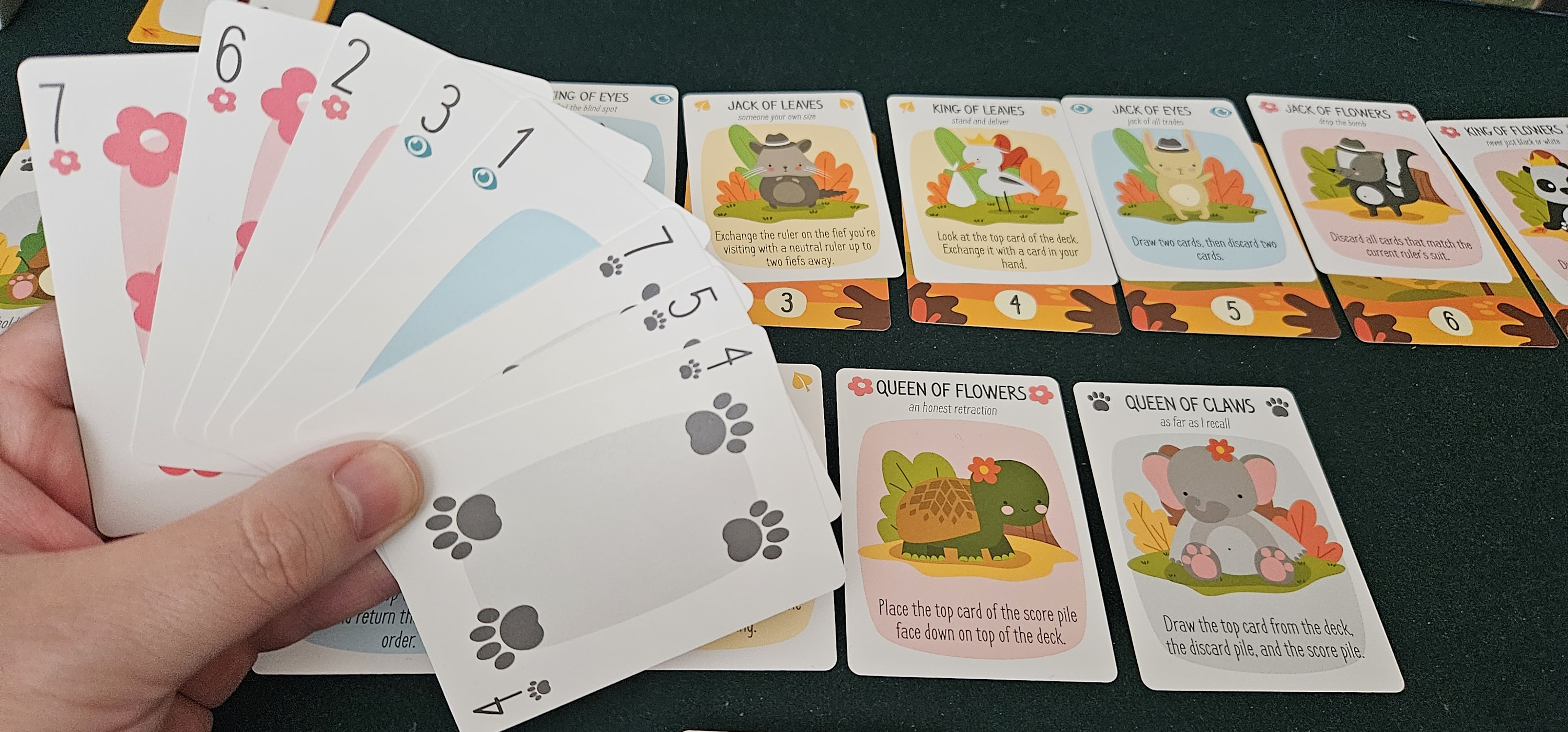 Su pulls a deft one with For Northwood! Rather than erasing — or even easing — the possibility of a bum hand, the entire game is structured around it. A full session consists of eight hands. The particulars of these hands are prepared from the get-go. Right away, you can see both how many tricks you’ll be expected to win and which suit is trump. You also have some helpers, animal companions whose special abilities can tweak the rules in your favor.