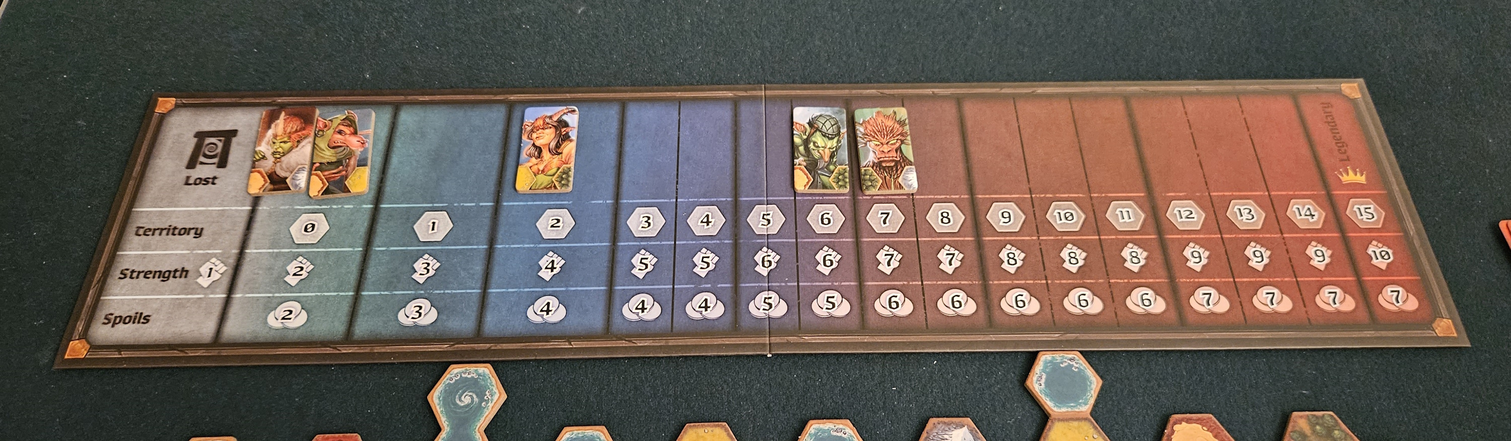 For those who, like me, struggle to keep Tigris & Euphrates’ wars straight, Lentz’s treatment of the process is significantly streamlined, although there’s only so much that can be pared away. This is Dawn of Ulos at its most phasey, and it’s important to keep the sequencing straight. The short version is that whenever a tile bridges two factions, it’s temporarily flipped face-down and both sides tally their strengths for an all-out war that will see one of them gobbling up their defeated foe’s now-vacated territory and the other disappearing into the annals of history. For a minute, anyway.