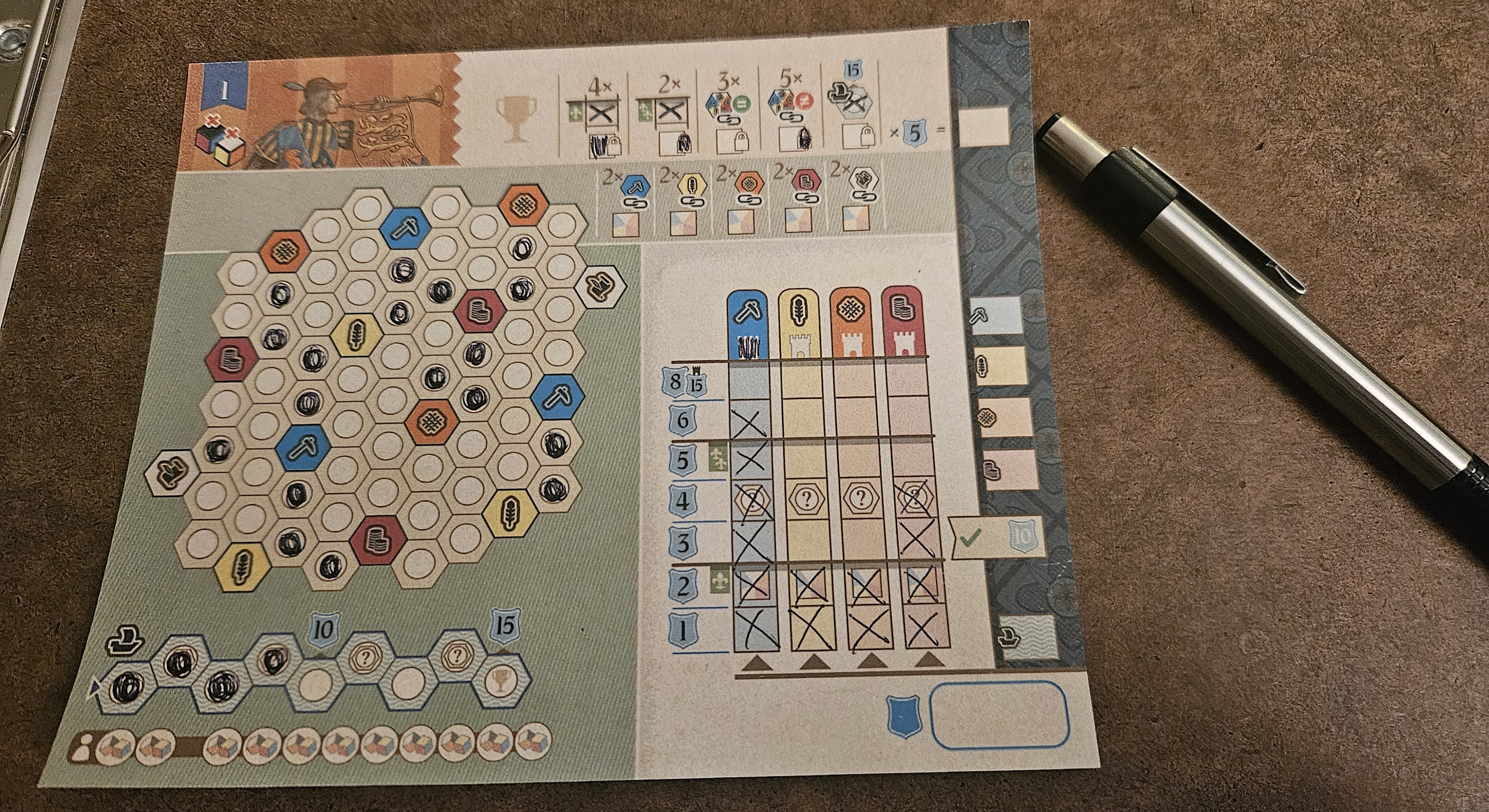 Right away, the roll-and-write format exchanges the meat of Cascadero for one minor benefit. That benefit is multiple maps. There are four in all, with each presenting its own novel challenge for the players to tackle. The first, which functions as a set of training wheels, offers fewer options at any given time. Others see the players fending off bandits, bridging far-flung destinations despite a kingdom-spanning river, or amassing trade goods. There’s a nice variety on display, and Knizia has created four scenarios that ask players to realign their priorities without significantly altering the rules or adding any real overhead.