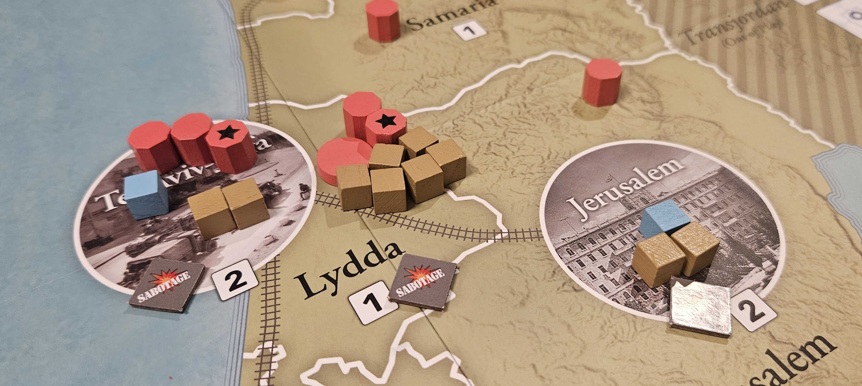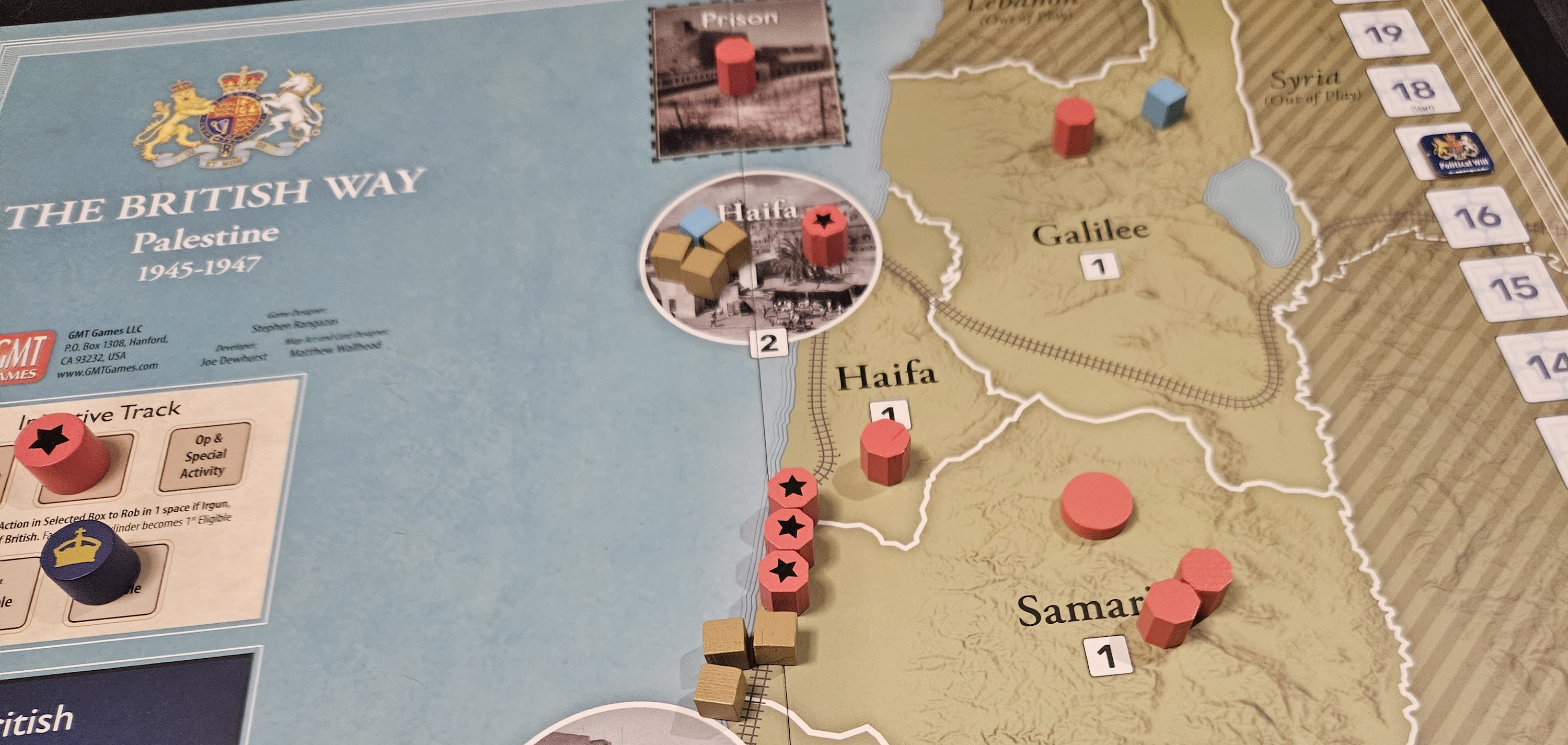 Dan might have his own take on this, but as the developer of the game I just wanted to say that it is something the designer and I spent a long time discussing, and we certainly didn’t mean to imply anything like “Palestine was an empty land”. The issue is that the tight scope and focus of the game didn’t really allow for any meaningful involvement of Palestinian Arab groups, particularly at the scale depicted by the game (with two players only, and focusing specifically on the post-WW2 Irgun campaign against the British, rather than the broader political debates). In the period covered (1945-1947) many of the militant Palestinian Arab groups were still recovering from the 1936-1939 revolt, and in some cases intentionally conserving their strength until after the British announced that they were leaving. There is a brief note about this at the start of the rulebook, and the designer is interested in re-using the same map for a prequel game that would cover the 1936-1939 Arab revolt in Palestine (we included some future proofing on the map with this in mind, such as the double naming of the “Tel Aviv-Jaffa” City space and the labeling of bordering countries to act as future playable spaces). There is no doubt much more that could be said about this decision, and I fully understand your concern, but hopefully this gives you some sense of why we took this approach with the game.