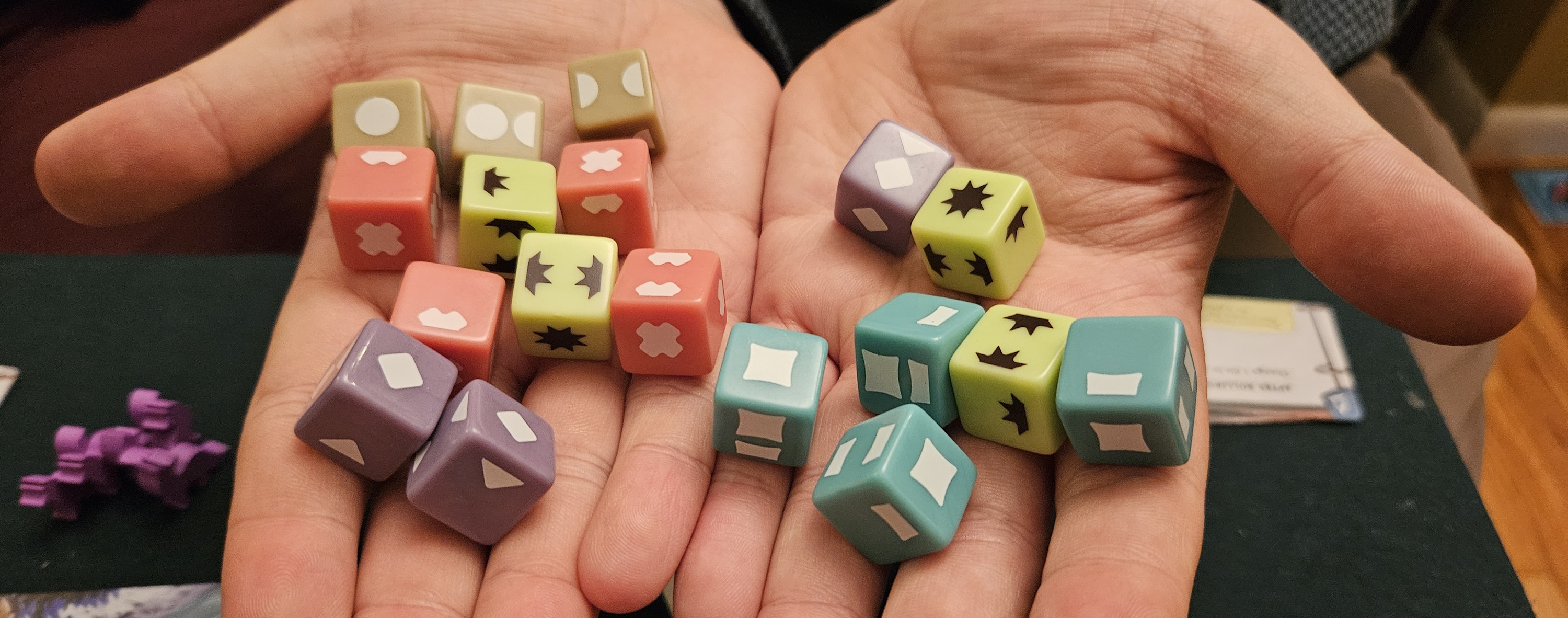 Mind you, the game still doesn’t quite fit her age. She pursued her research goals, but could make neither head nor tails of the sponsors. She struggled to recall the meaning behind all the symbols placed before her, and never worried too hard about chasing matches. Also, she drew all over her player board with her dry-erase pen, necessitating an emergency alcohol swab. It’s hardly her fault; the boards look like they should be scribbled on. If anything, the board upgrades would have functioned better with pens than tokens. With so many dice tumbling around, they’re far too easy to scatter.