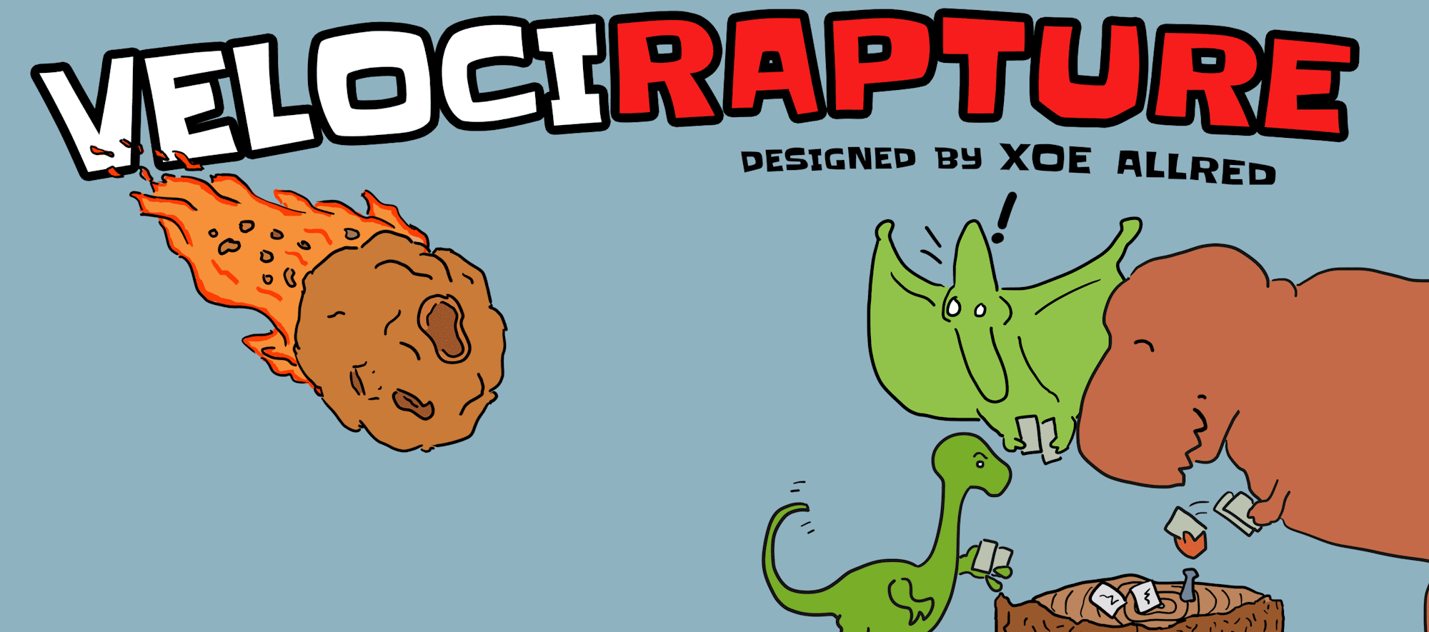 The short playtime isn’t listed as one of the important rules, but it ought to be. The first time we played Velocirapture, we gave ourselves 20 minutes. The experience went stale around minute eight. But the meteor was still tearing the atmosphere to shreds, so we soldiered on. That’s another things humans do. We persist for the sake of completing things. Just ask everybody who’s ever wrapped up a Netflix series even after it became plain that the service ordered too many episodes.