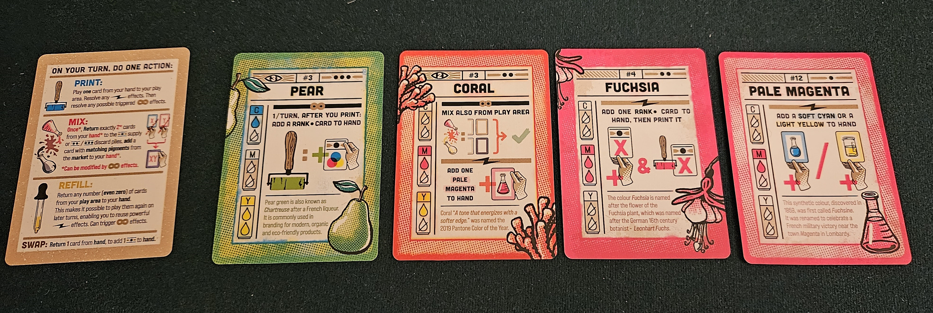 That goes for other colors, too, to varying degrees. Cerulean is ace at rapidly filling your hand with basic cards. Raspberry breaks the game, letting you mix with three or more cards and thereby tossing out stacks of basics to create complex colors. Prism permits some gambling via blind draws. Even the basic colors are essential. As anyone with a printer knows, letting those CMY cartridges run dry means nothing gets made.