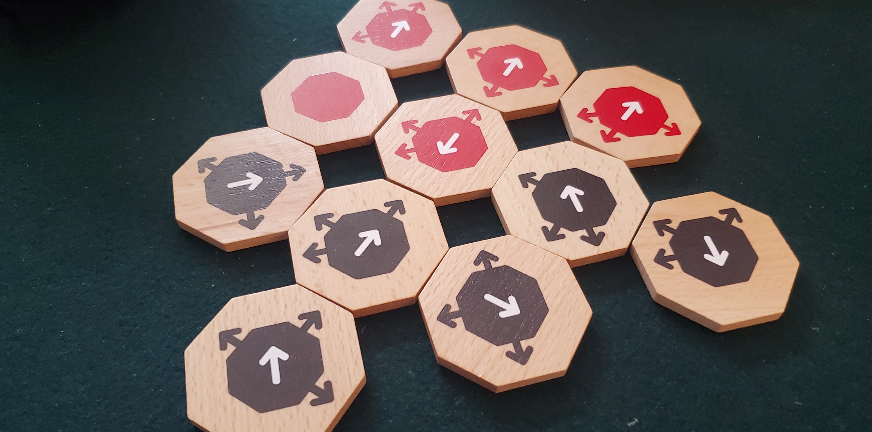 This is a messy process. Messy as a conceit, because the tiles aren’t especially prohibitive, meaning it’s a rare turn that won’t see you flipping quite a few of them, and also because the entire pool is available to both players from the outset. Talk about information overload. Further, it’s also messy on the table. Flipped tiles must be correctly oriented, itself not such a difficult task — they always flip along the axis of their inner arrow — but fiddly en masse, which is exactly how you’ll likely be flipping them. It’s the sort of game that begs to be constantly pressed back together as the spacing and orientation of its tiles becomes increasingly flabby from being manipulated so often.