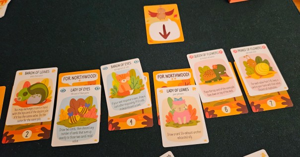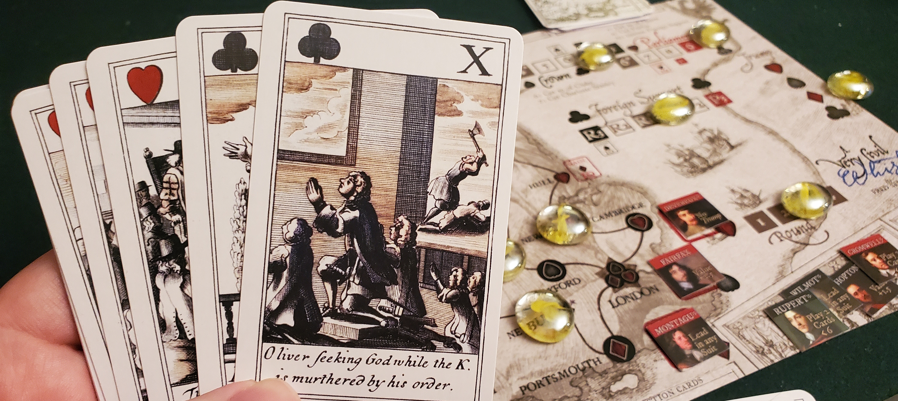 The first of two Serval trick-takers I played this year (although the second one hasn’t been released yet), A Very Civil Whist is most easily described as trick-taking meets States of Siege. Players command either the Royalists or Parliamentarians, playing cards to nudge themselves forward along four tracks and either save or lop off the king’s head. Trick-taking has begun to edge into hybrid design, with maps and area control and all that jazz, and this is possibly the breeziest entry point into a wild world where tricks are only one component of a larger whole.