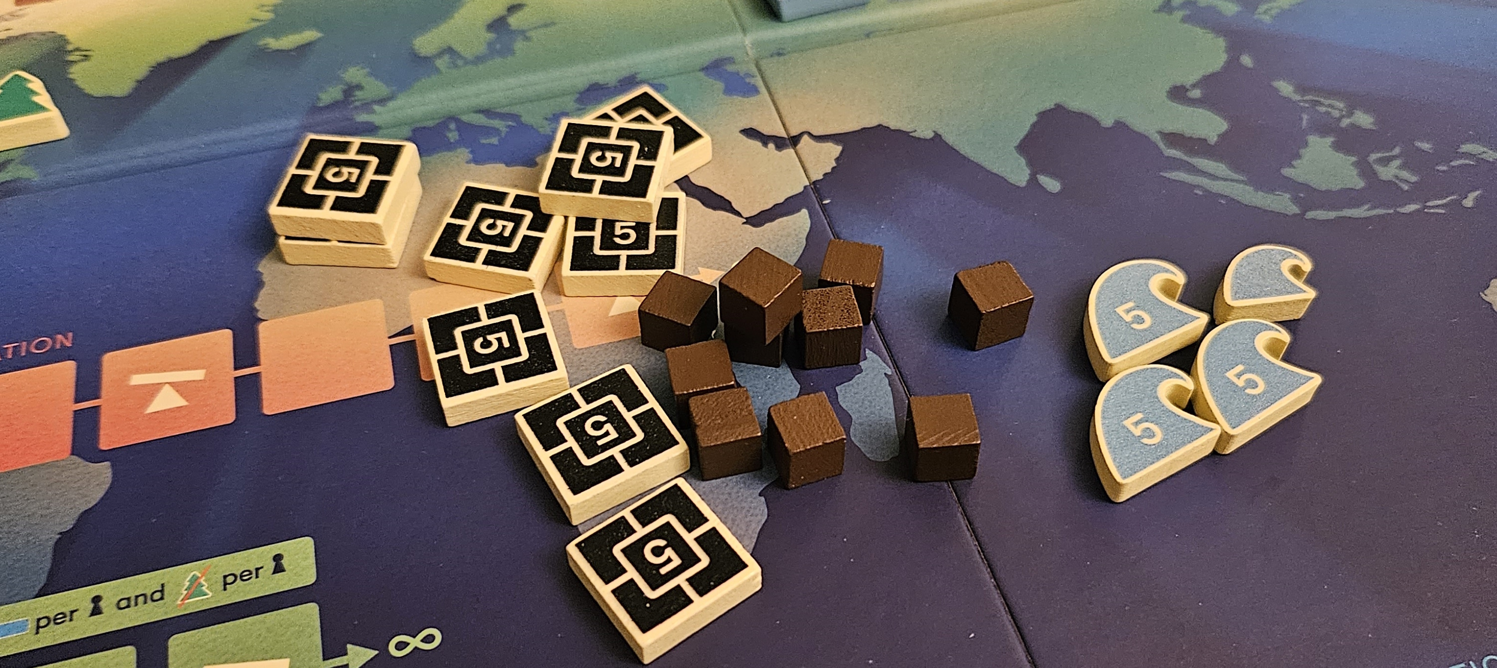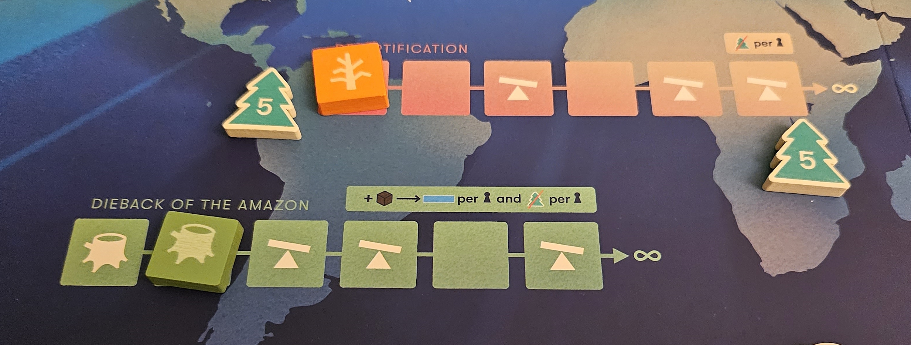 A session of Pandemic where you win by removing every infection cube sounds very dull indeed, necessitating a novel approach. Unlike Pandemic and the Forbidden series, there is no geography to consider. Rather than occupying a definite space, the entire world is your domain. You play as one of four entities, each geographically bounded in fact but not in terms of play. China, the United States, Europe, and the Majority World all occupy an identical non-space. You are everywhere and nowhere at once. As such, your projects have infinite reach, applying their effects to the global balance sheet of carbon regardless of any real-world concerns. To wit, the setup shows trees and ocean currents dotted across the map, but spreading them around has no gameplay effect. It’s easier to pile them all in one place, the better for counting.