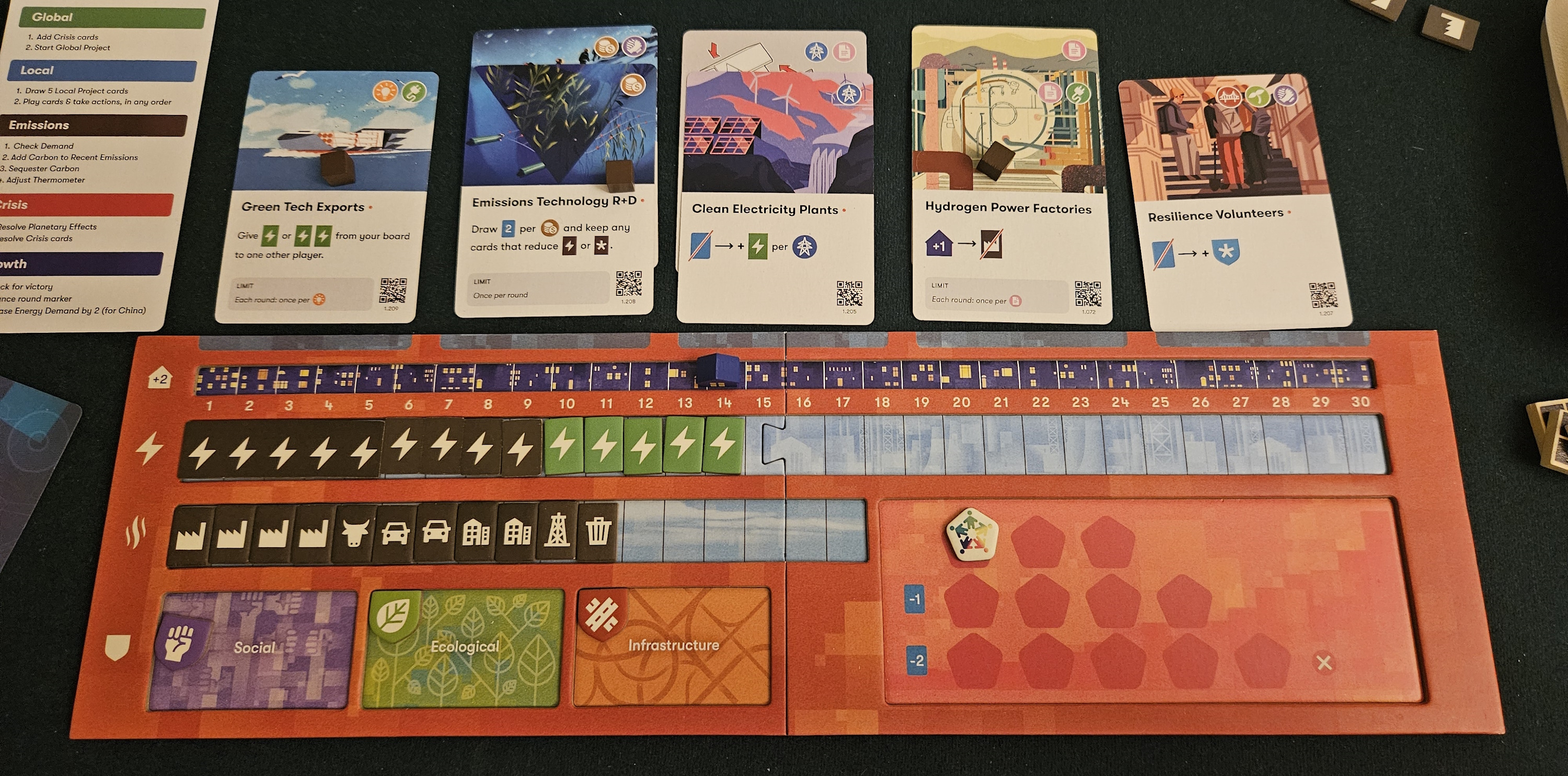 Where I think Daybreak succeeds is its ability to present a possible future, a vision of where we could go. It ignores some of the darker aspects, but I think this is intentional (I think many of us suffer enough from ‘climate doomerism’ as it is). Working on the field of climate change is often depressing, this game is not. And I think the game makes great strides in addressing much of the skepticism and doubt that many are presented with.