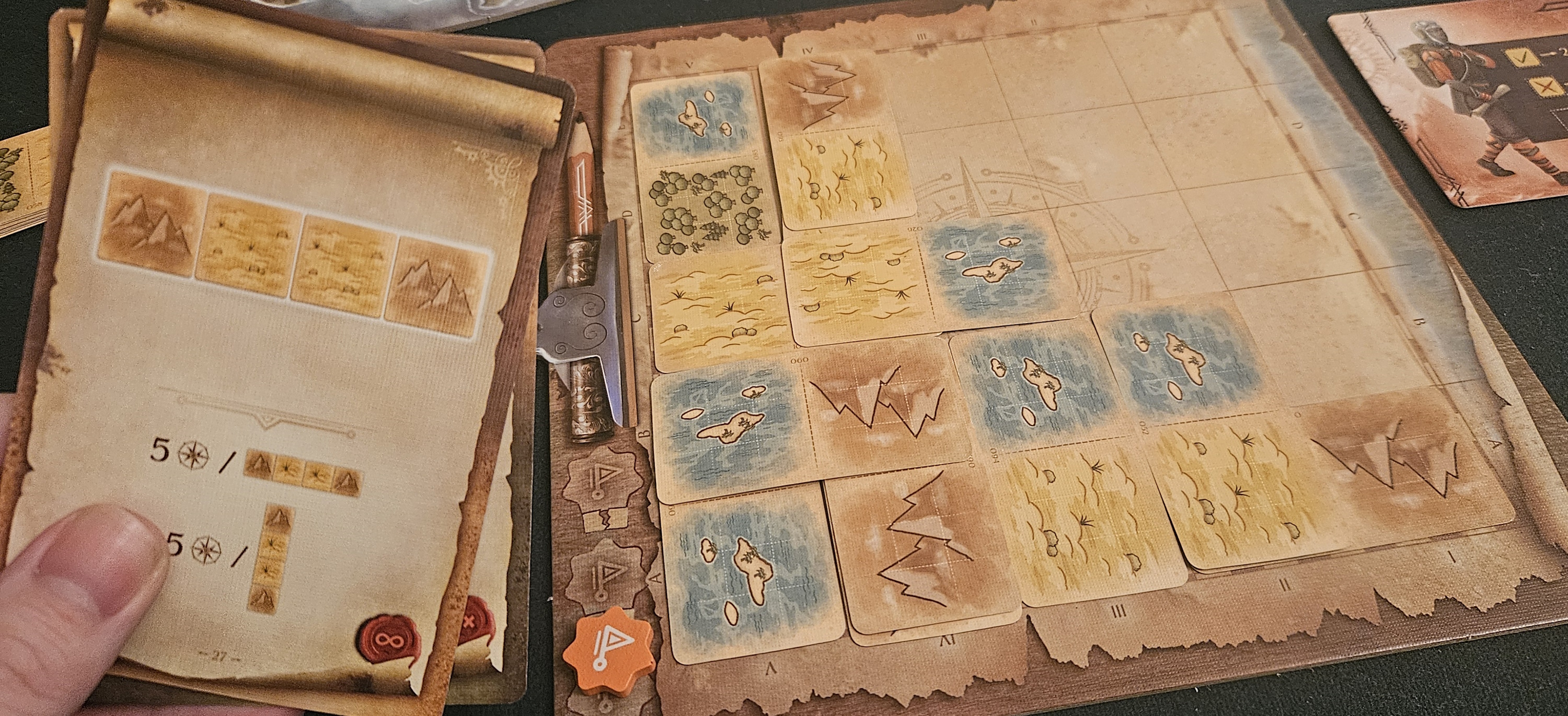 And that’s before we even consider the final scoring goal. As we move around the island, we aren’t only occupied by mapping. We can also deploy research claims, little flags that mark a stretch of terrain as belonging to us. This encourages us to chart large blocs of matching tiles. This is Maps of Misterra at its most perceptive, a reminder that maps are not only representations of reality, but claims on reality. We aren’t mapping this island for curiosity’s sake alone. We’re mapping this place so we can possess it.
