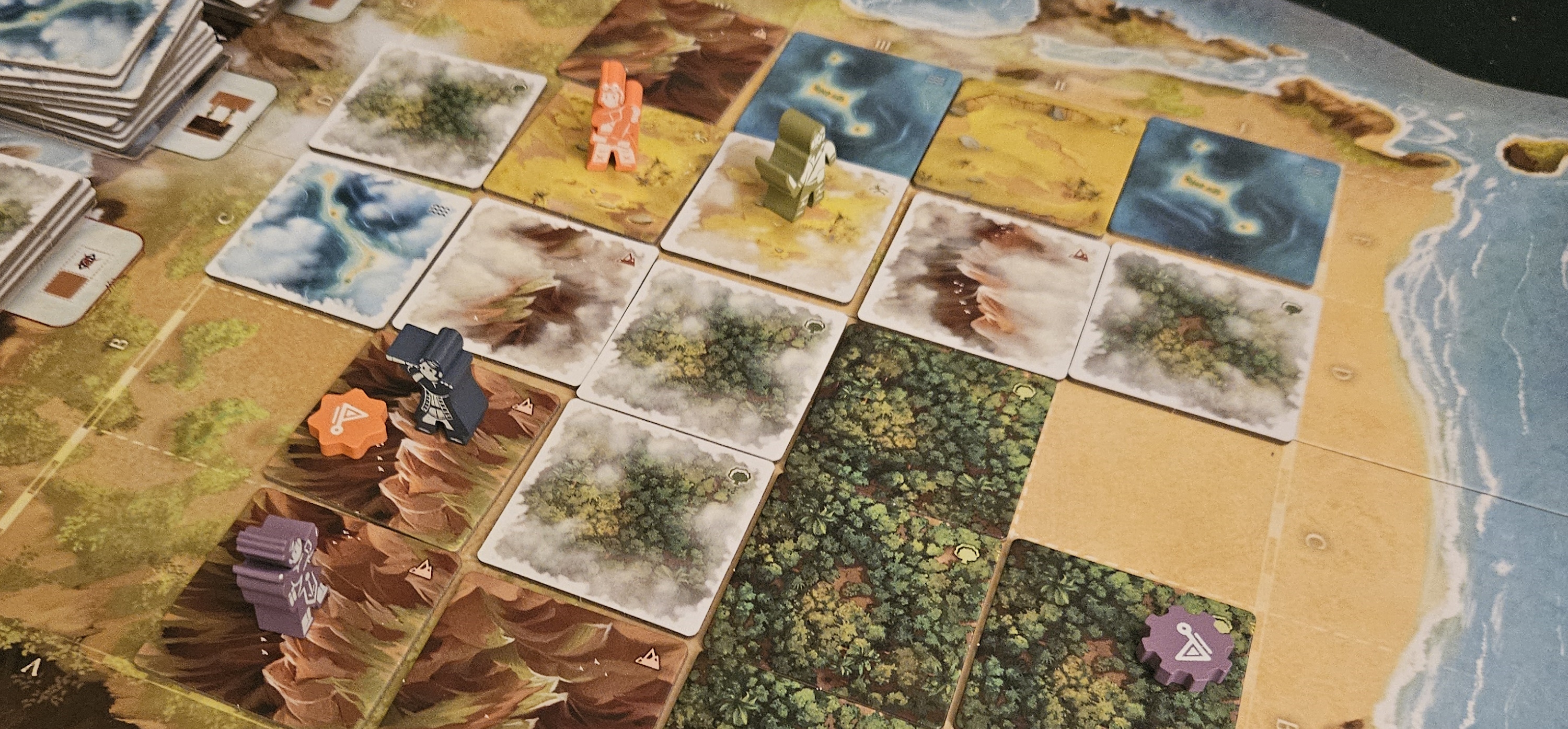 As actions go, there’s really nothing too complex or befuddling here. There are only three actions in the game, with the trickiest being the process of mapping itself. This requires players to pay keen attention to the state of both their personal map and the state of the larger board. When you add terrain to your map, it deploys matching terrain to the island — first as cloudy “unconfirmed” terrain, and then, once the lay of the land is confirmed either by you or another player via a second card, is flipped to its more resolute, unchangeable side. Bit by bit, the shape and composition of the island are summoned into being.