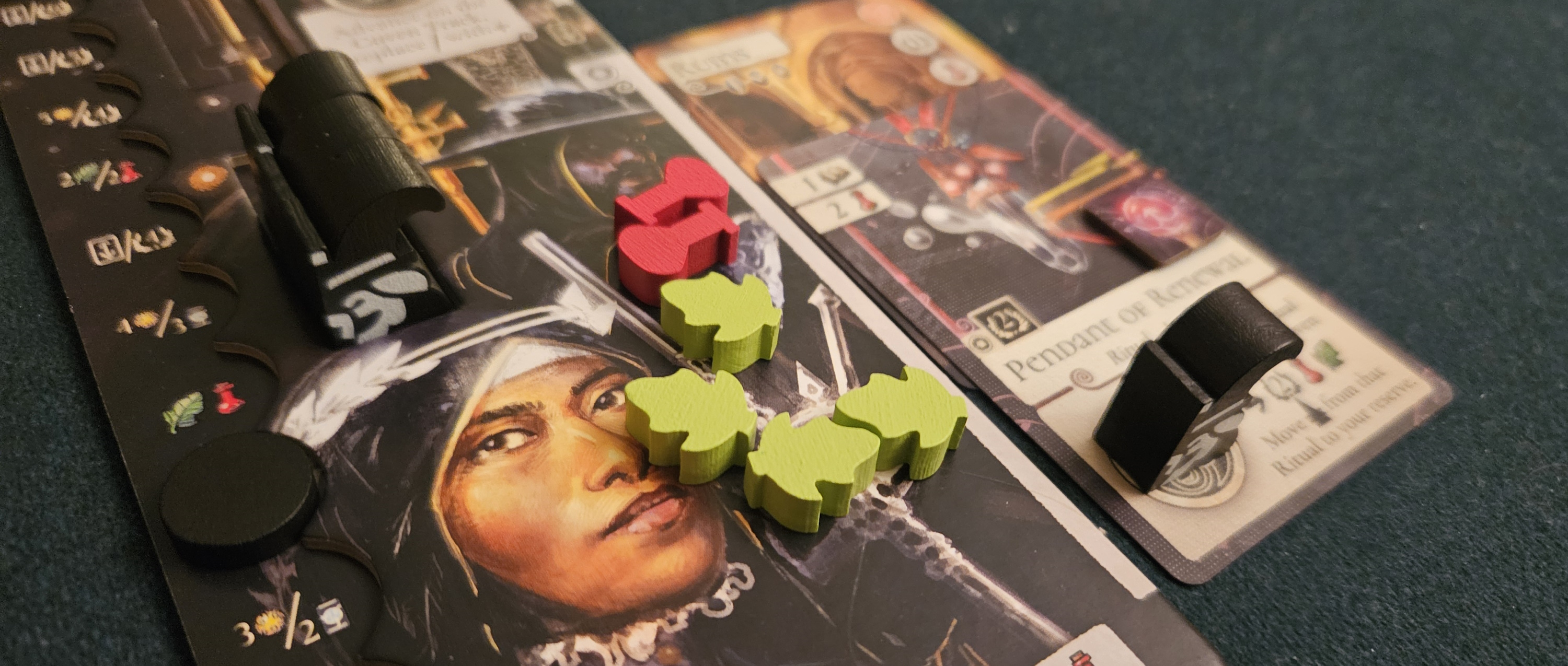 At times, that trickle becomes disappointing. While some rituals are exciting, many others exist to churn out a few points. Paradoxically, its resource conversion leans so far onto the permissive side of the line, with multiple spots letting you exchange any resource for any others, that various moves feel samey and unimportant. Despite its many cards and some truly lovely illustrations, wrapping up a session has a somniferous effect, like driving through a fog for ninety minutes only to be asked about the scenery. Apart from a few standouts — all having to do with the game’s four factions — I couldn’t tell you what distinguished one session from another. It’s all a haze.
