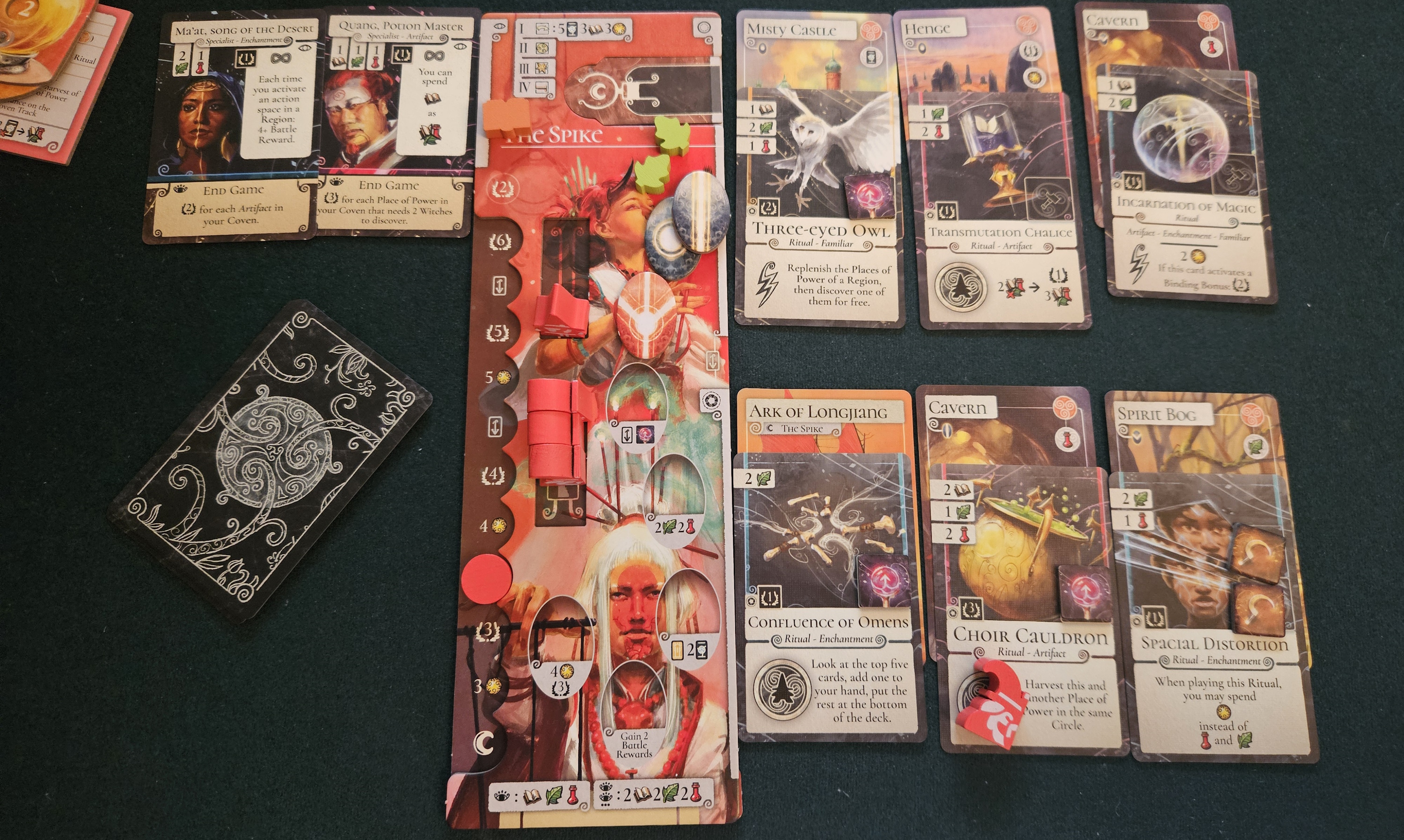 To its credit, everything coheres. Deployed witches bring home resources and sites, but also stick around to duke it out with rival covens. Resources are gained in three or four ways, but are readily spent on incoming rituals and specialists. As a set of rules, it’s perfectly smooth.
