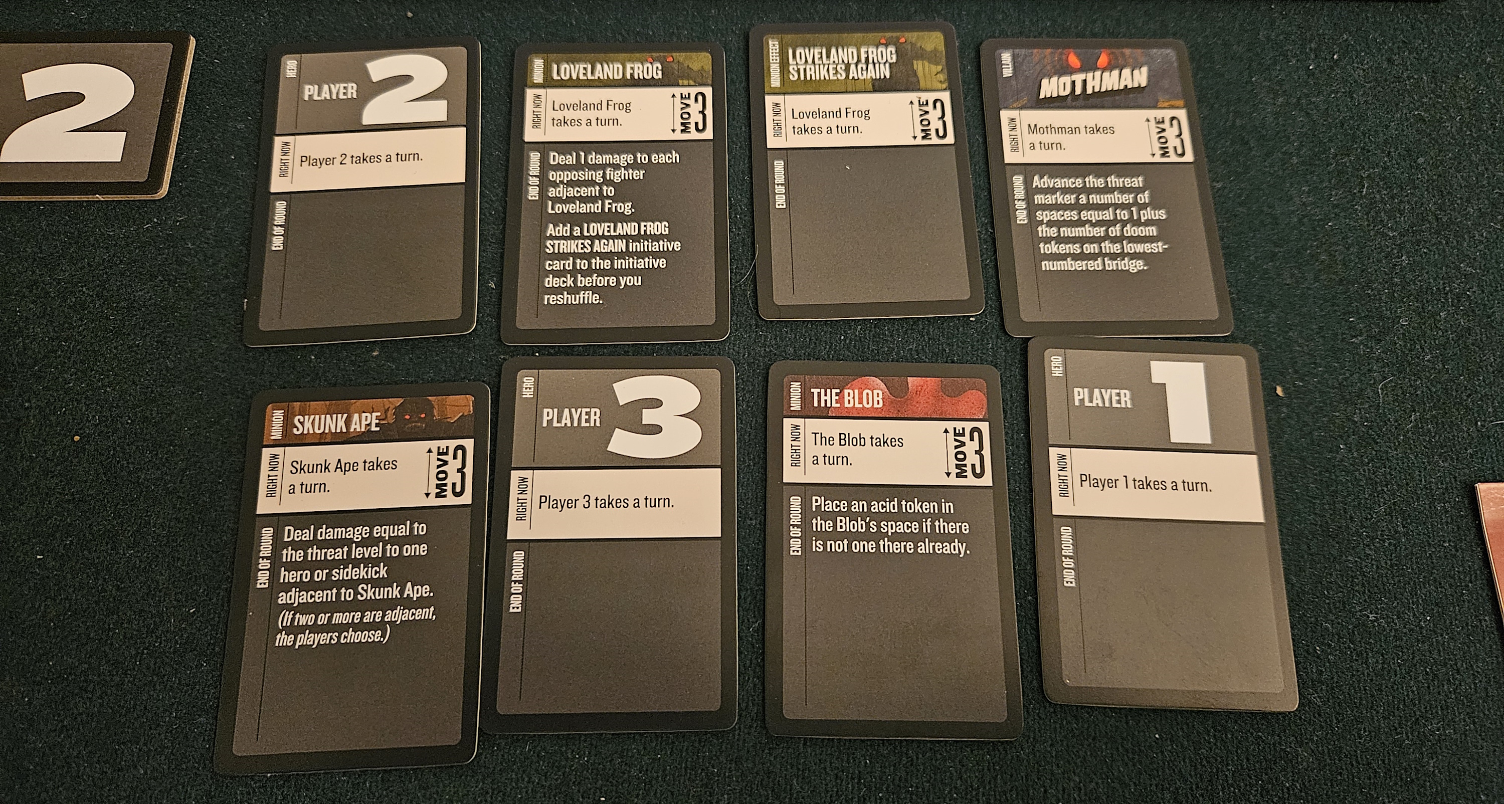 I can’t wait to play this again. The last game was T-Rex (me), Spiderman, Cloak and Dagger, and Tesla. It was a close finish (due to threats from Mothman on the bridges).