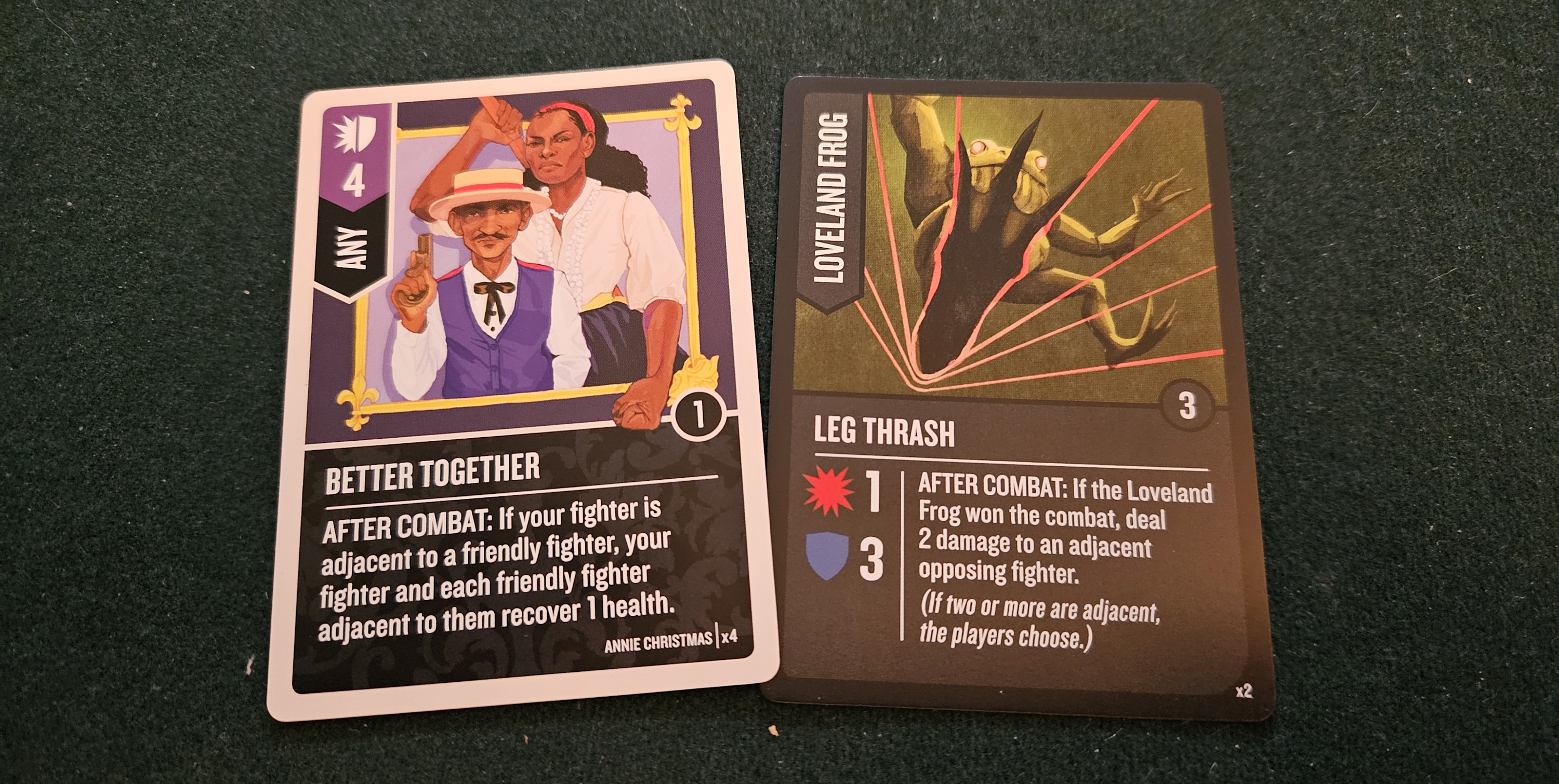 These instances of combat, by the way, are resolved in exactly the same manner as the rest of the battles in Unmatched. Each enemy has its own deck for both attack and defense, while other abilities are offloaded to their initiative cards. These soon establish each creature’s personality. The Skunk Ape isn’t so tough until the end of the round, when his natural perfume wallops anybody standing nearby. The Loveland Frog lashes the heroes with weaker attacks, but gradually tucks extra cards into the initiative deck for additional turns. The Blob splashes pools of hero-burning acid onto the board. That sort of thing.