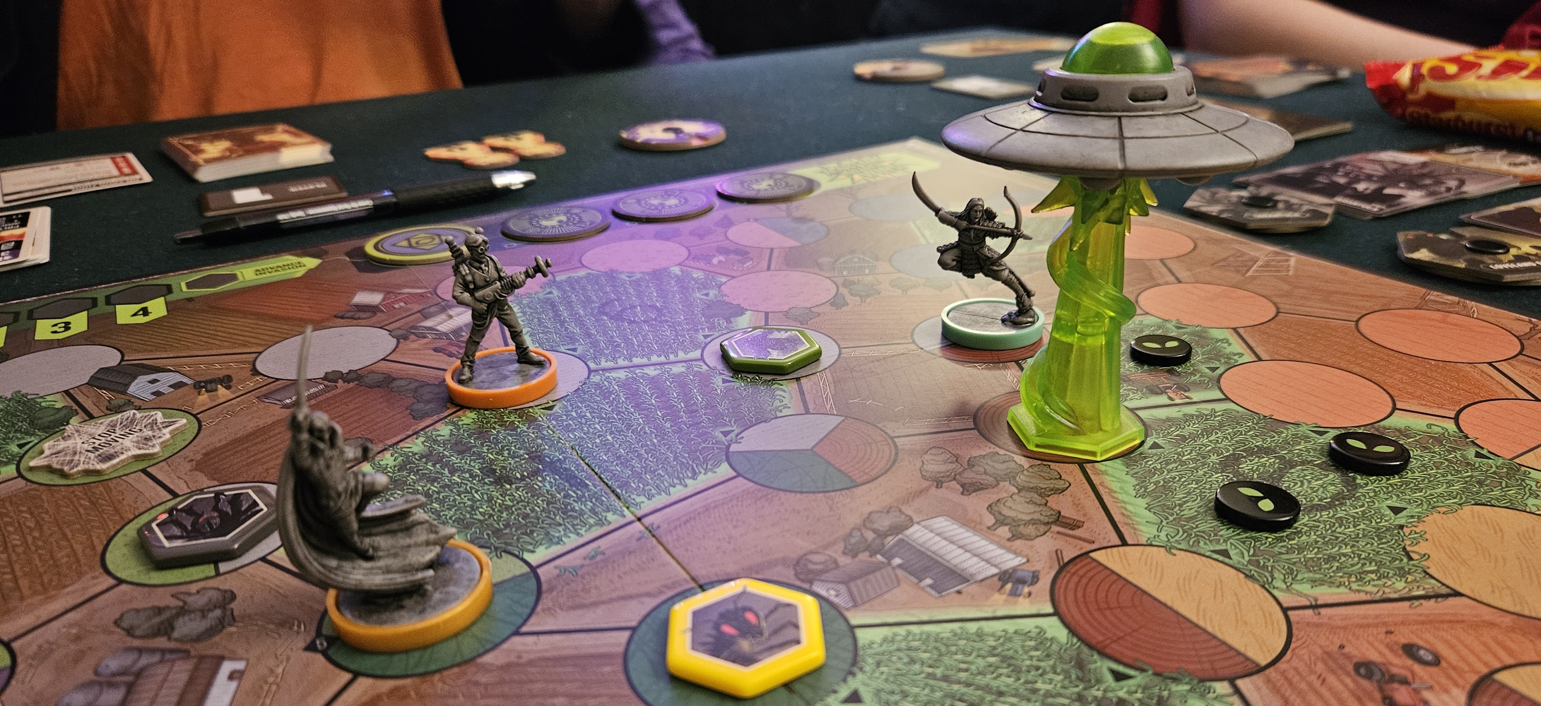 Those big bads, by the way, aren’t interchangeable the way the smaller cryptids are. That’s because they’re tethered directly to their maps. Mothman is dismantling the city’s bridges while the Martian Invader burns crop circles into the local fields. Both are metered by “threat” tokens, which gradually appear courtesy of their initiative and battle cards. These have various effects, but they’re both dangerous. Good thing, then, that they can be removed by timely maneuvers, giving players more to do while shifting around the map and drawing cards.