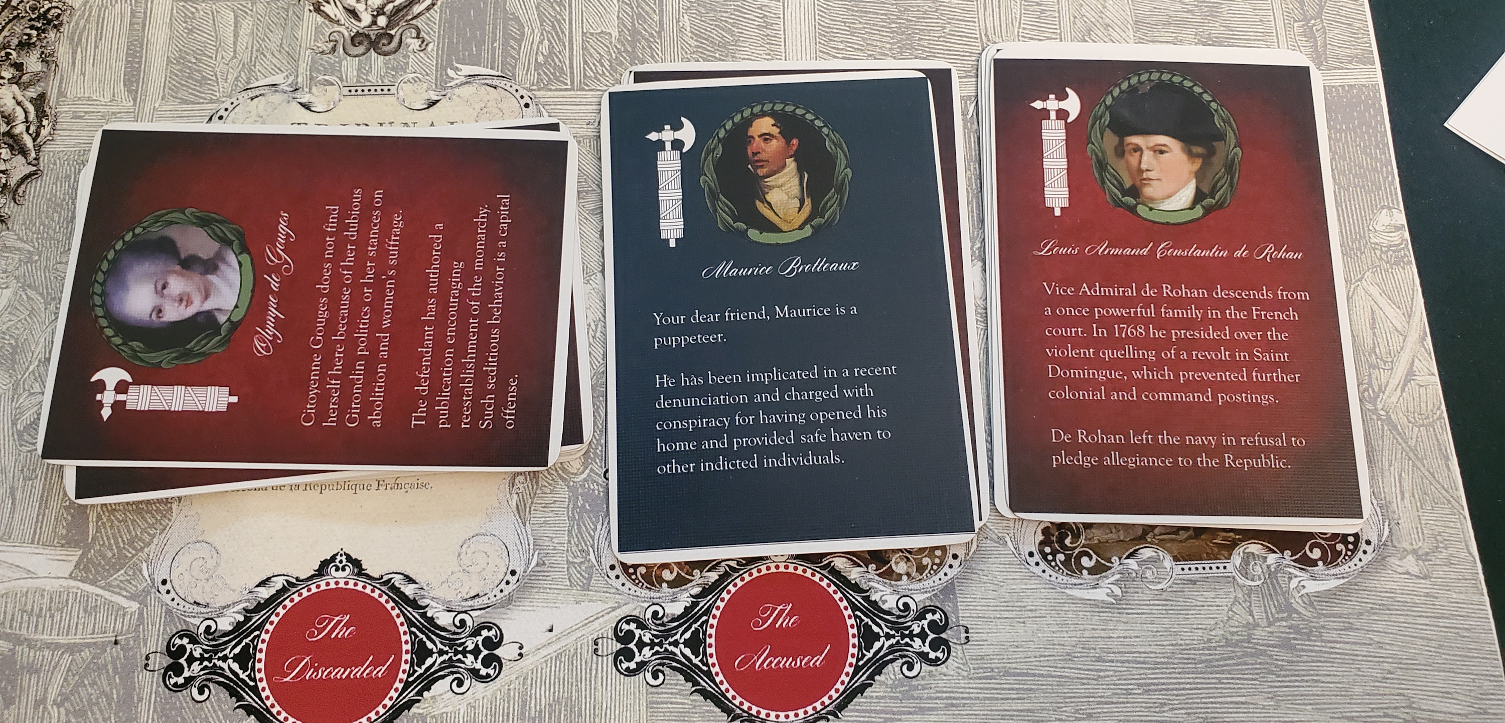 Another title, this one designed by Dan Bullock, was one of my favorite gaming experiences of the past year, yet its atypical nature proved divisive upon release and, were I to reassess the game solely via the criterion of repeatability, there wouldn’t be much positive to say about it. That game was The Gods Will Have Blood, a twenty-minute solitaire game that casts the player as a magistrate overseeing executions during the Reign of Terror. In crafting The Gods Will Have Blood, Bullock makes a number of decisions that are nearly iconoclastic in their irreverence for the received wisdom of good game design. Player agency is strictly limited, and in some cases is overturned by the whims of the court they ostensibly oversee. Meanwhile, the guilt or innocence of the accused is assessed based on a snippet of text printed on the front of their card, while the consequences for their execution or exoneration is printed on the back. This adds an inverted system of memory to the game. The better one recalls the outcome of any given sentence, the more predictable the game becomes. This could be considered a weakness, as predictability dulls the feverous uncertainty of your actions.