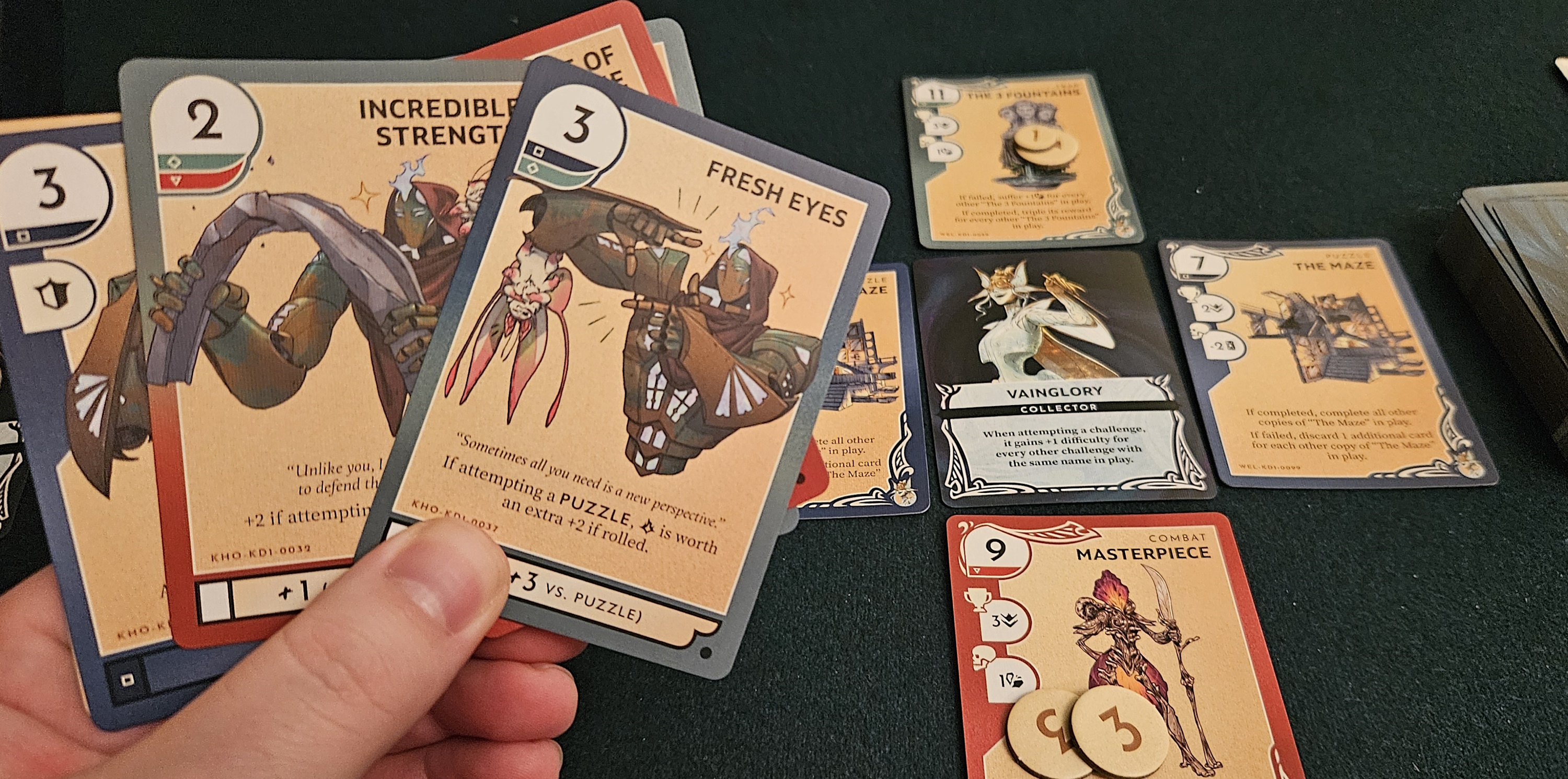 Put together, the whole thing is buttery smooth. The choices feel great. The characters feel great. Even the penalties feel great in their own way, forcing little quirks or adaptations. On more than one occasion, I’ve struggled to pick between firing up my lantern or tossing out one of Vainglory’s exhaustion cards. Or, more often, between tackling one challenge or another. Nicely, some challenges might be desirable to keep around. There’s the maze, a card that gets harder as more mazes are added. But completing one maze also completes every other maze in play. What was once a relatively straightforward challenge is now a chance to clear the table and absolutely rip through the well. Far from being an obvious choice, though, this is a gamble. You might not ever draw another maze. Or you might be overwhelmed by the orchestra, a baddie that deals damage whenever a blue challenge card is drawn. Or you might get sick of waiting around for more mazes. There are all sorts of perils afoot.