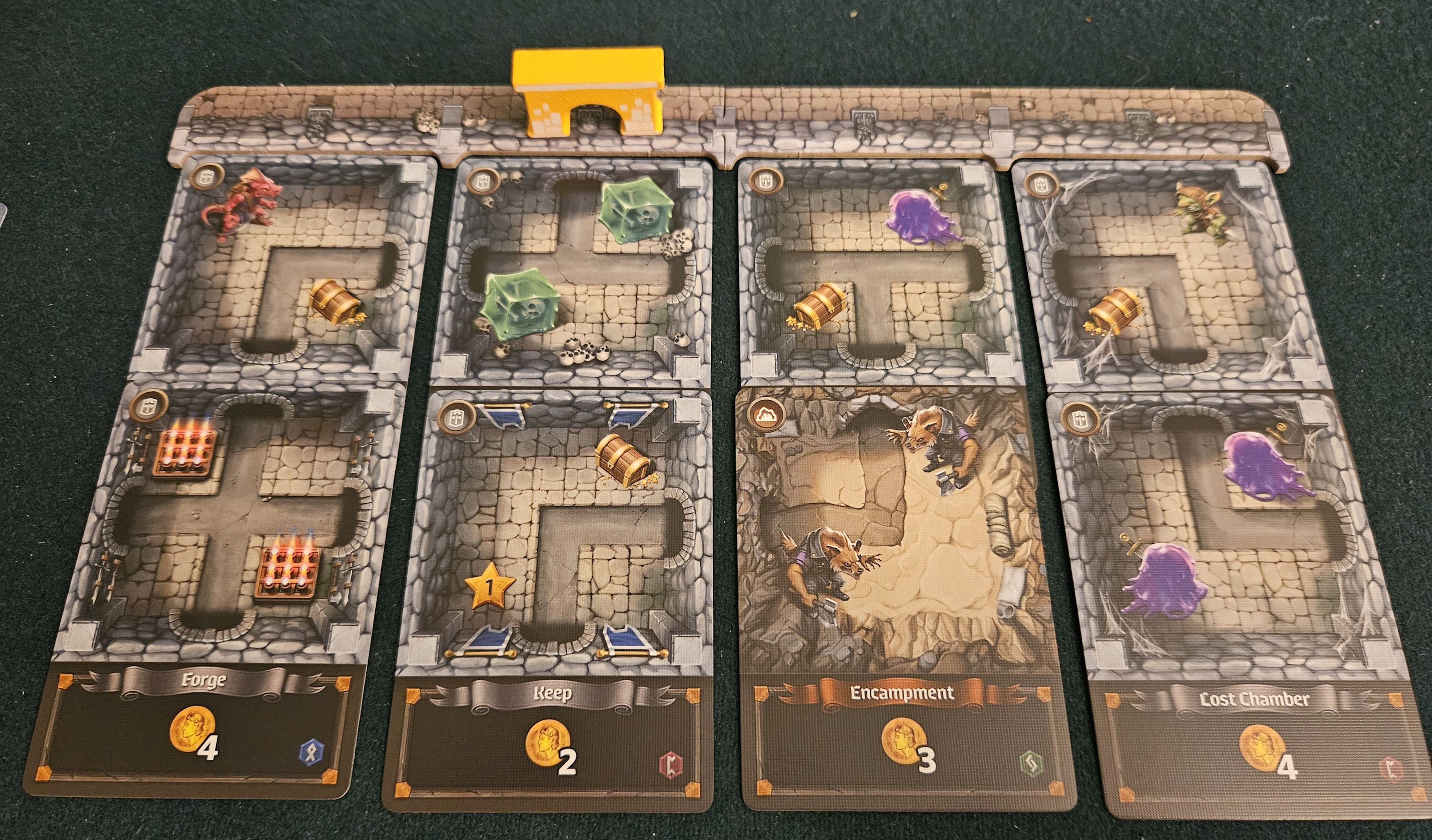 Gold isn’t important in its own right. Sure, having a lot of gold can nab you an early slot in initiative order, although this isn’t especially important until the last round, when one’s initiative earns points and perhaps functions as a tiebreaker. Before then, initiative and gold are spent in the market. This is a clever addition, functioning almost like a patch in the event of a poor draw. If you need a certain type of monster — kobolds, say — but only draw different monsters — green goops, perhaps — then the market might provide what you need. Might. It isn’t a sure thing. But it’s one more opportunity to nab the stuff you need, swapping gold (and therefore a strong position in initiative order) for extra features.