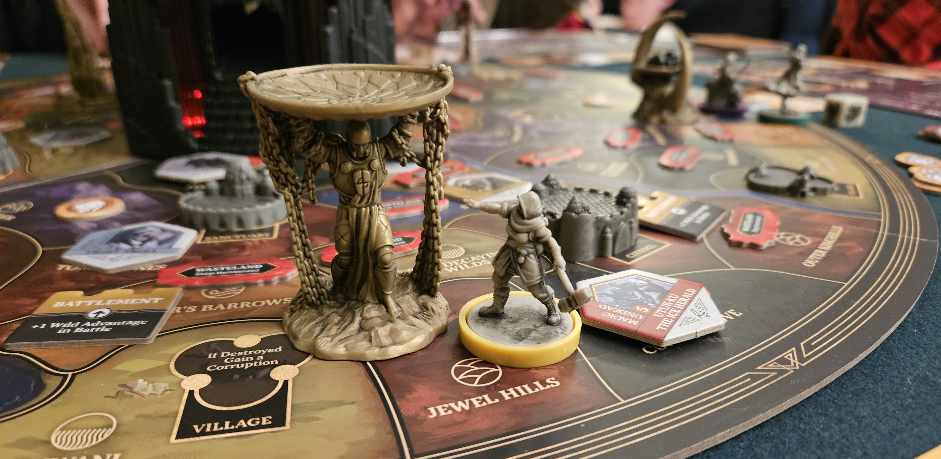 On paper, they’re nothing of the sort. During play, they’re nothing of the sort. These tokens are added to the map courtesy of the app, one more event among all the other terrible things that can befall you. And yeah, they’re nasty. Whatever the big bad is up to, it’s despoiling the land. Every few months, another handful of territories are ruined. And these wastelands are awful. The gist is that your hero is halted in their tracks whenever they move into one. At first, it’s no big deal. The geography is sufficiently tangled that there will be ways around any obstacle. By the third and fourth month of the game, getting from one place to another is a real pain in the butt. In some cases, essential destinations will become isolated.