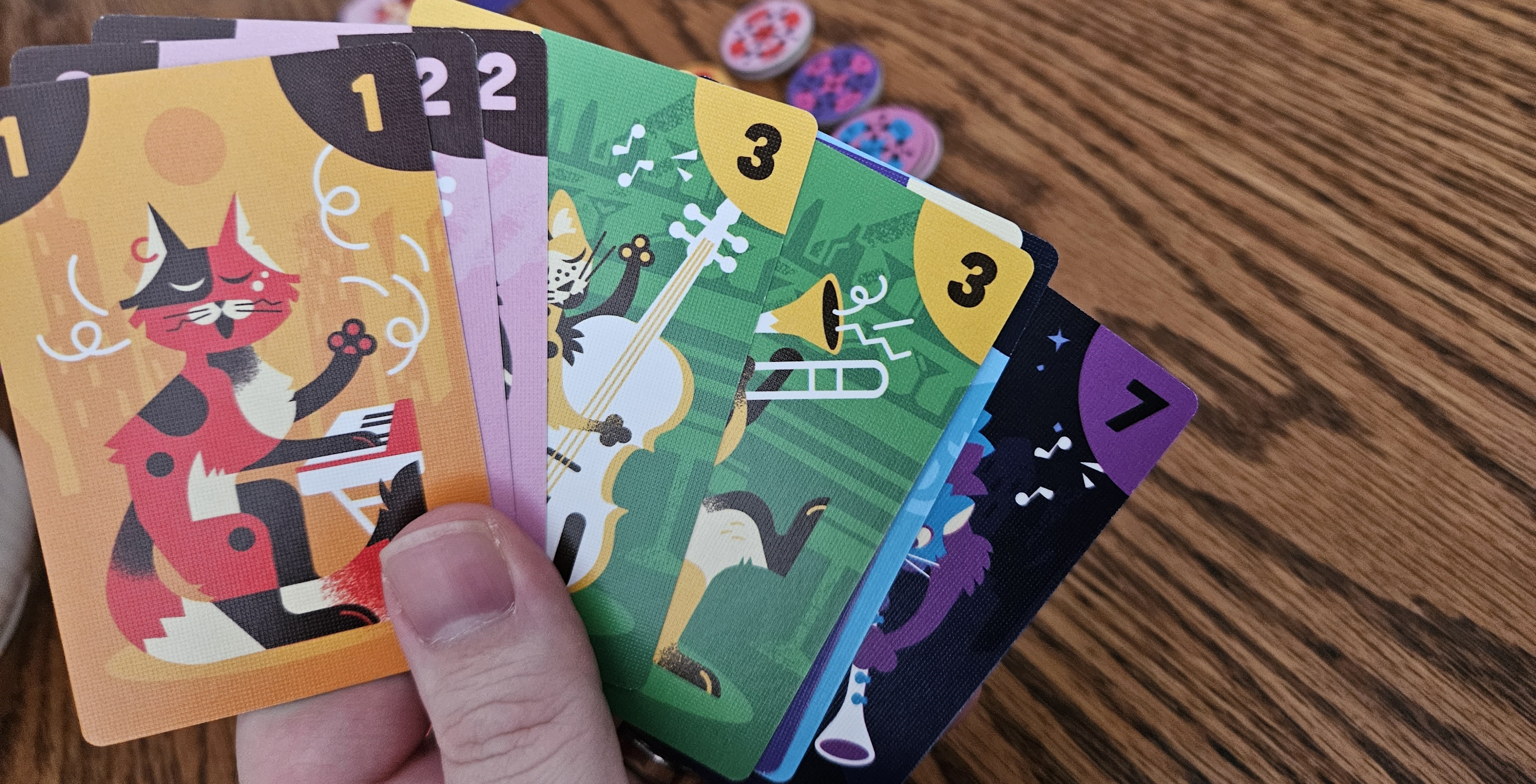 A few changes amplify the acoustics of this edition. There’s a new seventh ranked suit that can also be played as quartets, but only for points rather than for those bonus endgame tokens. Players also draw back up to four cards after playing a quartet, preventing anybody from so severely depleting their hand that they’re knocked out of the game — although purists like myself may find this a little too chancy. A full session, by the way, is three full games rather than only one, creating a nice arc and giving Cat Blues a fuller body to draw from. And, of course, the count is wisely restricted to only four players.