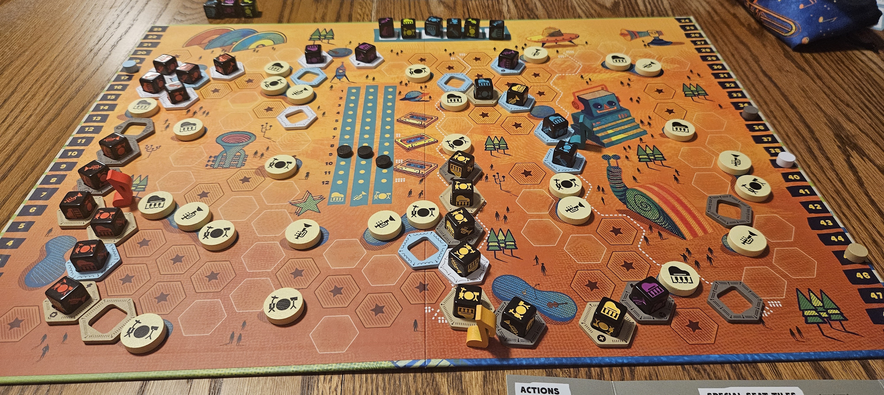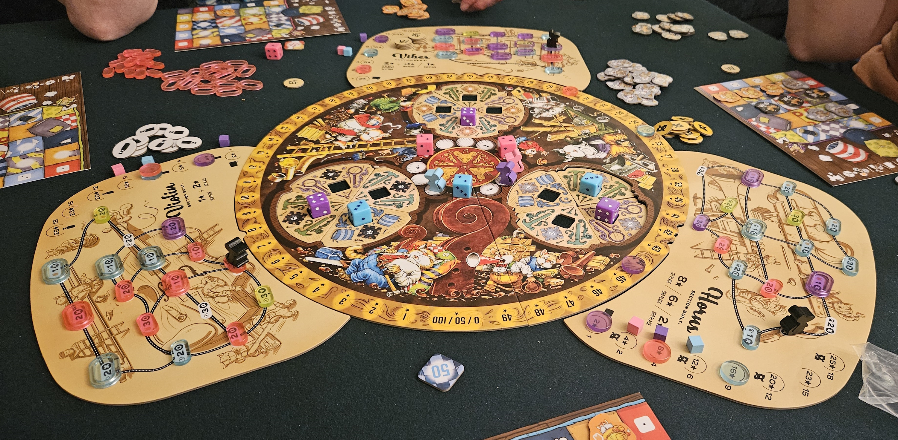 There are twelve instruments in all, each with their own scoring goals. Only three are used per session, allowing quite a bit of modularity. Meanwhile, there are those mouse inspectors. These travel between components to award points to whomever finished them. This encourages the aforementioned selective upgrading; if you move a mouse onto a space that you finished but I upgraded, we’ll both score points for it. Moreover, we can bribe inspectors with cheese to skip spaces entirely, thus depriving opponents of their hard-earned points. Seriously, this game’s veiled commentary is so sharp that I’m talking myself into liking it more.