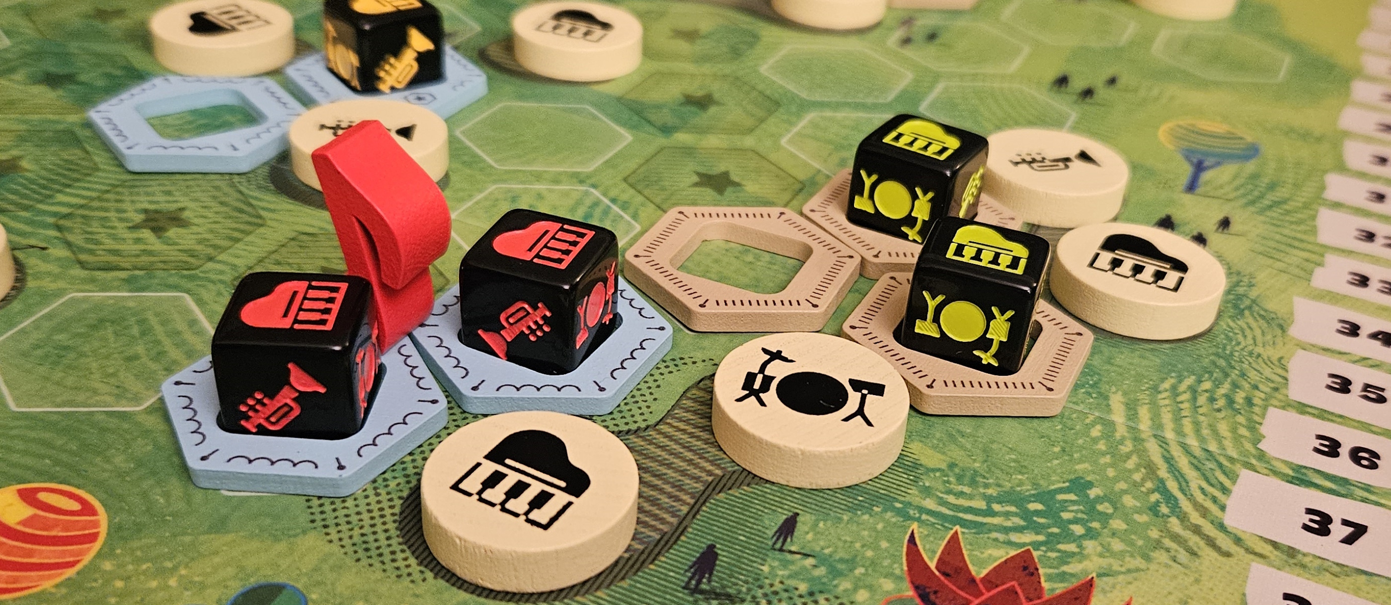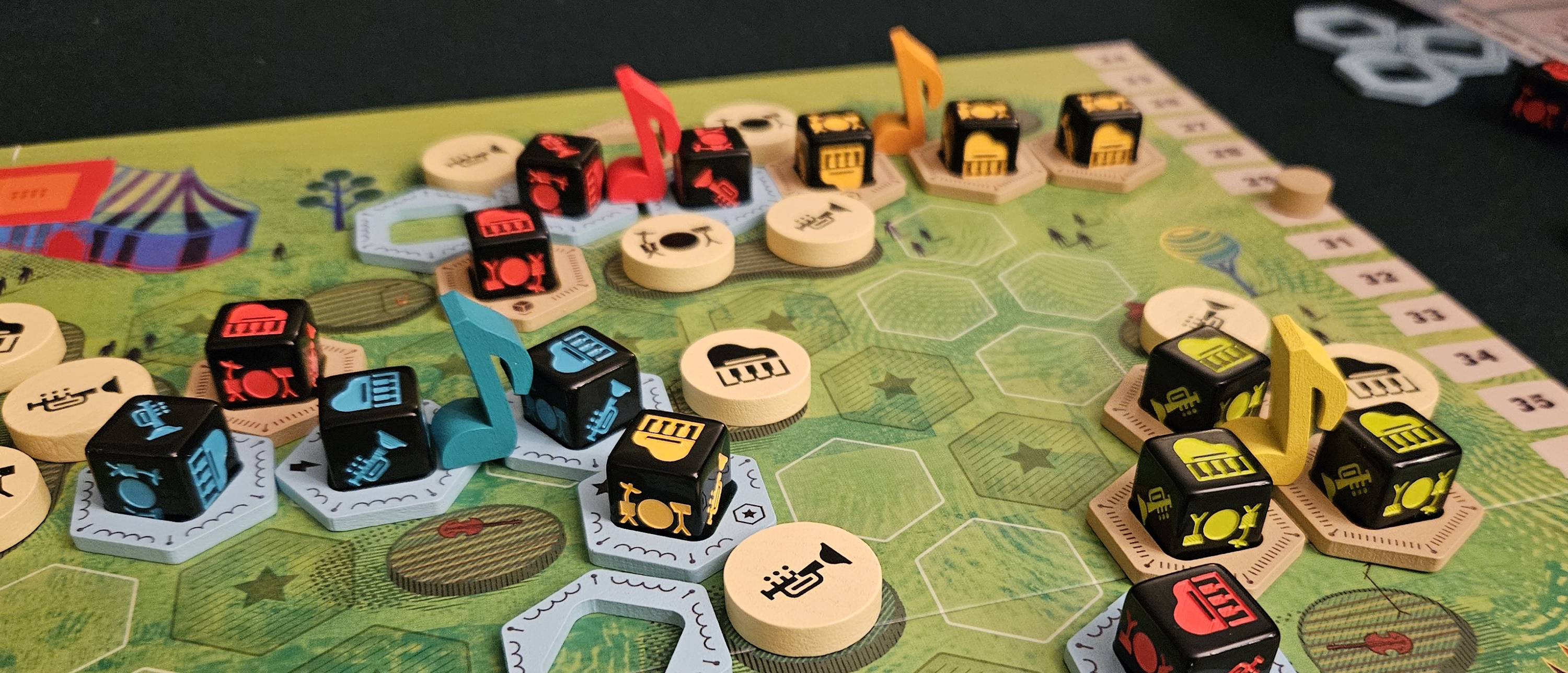 When the game begins, you’re presented with a wide-open festival space. Multiple bandstands display potential instrumentalists, divided between percussion, horns, and keyboards. There are also heaps of dice across five colors; the show’s guests and your customers, each showing preferences for the instruments they’d like to hear. Lastly, each player has their own wooden bases for securing territory and putting butts in seats.