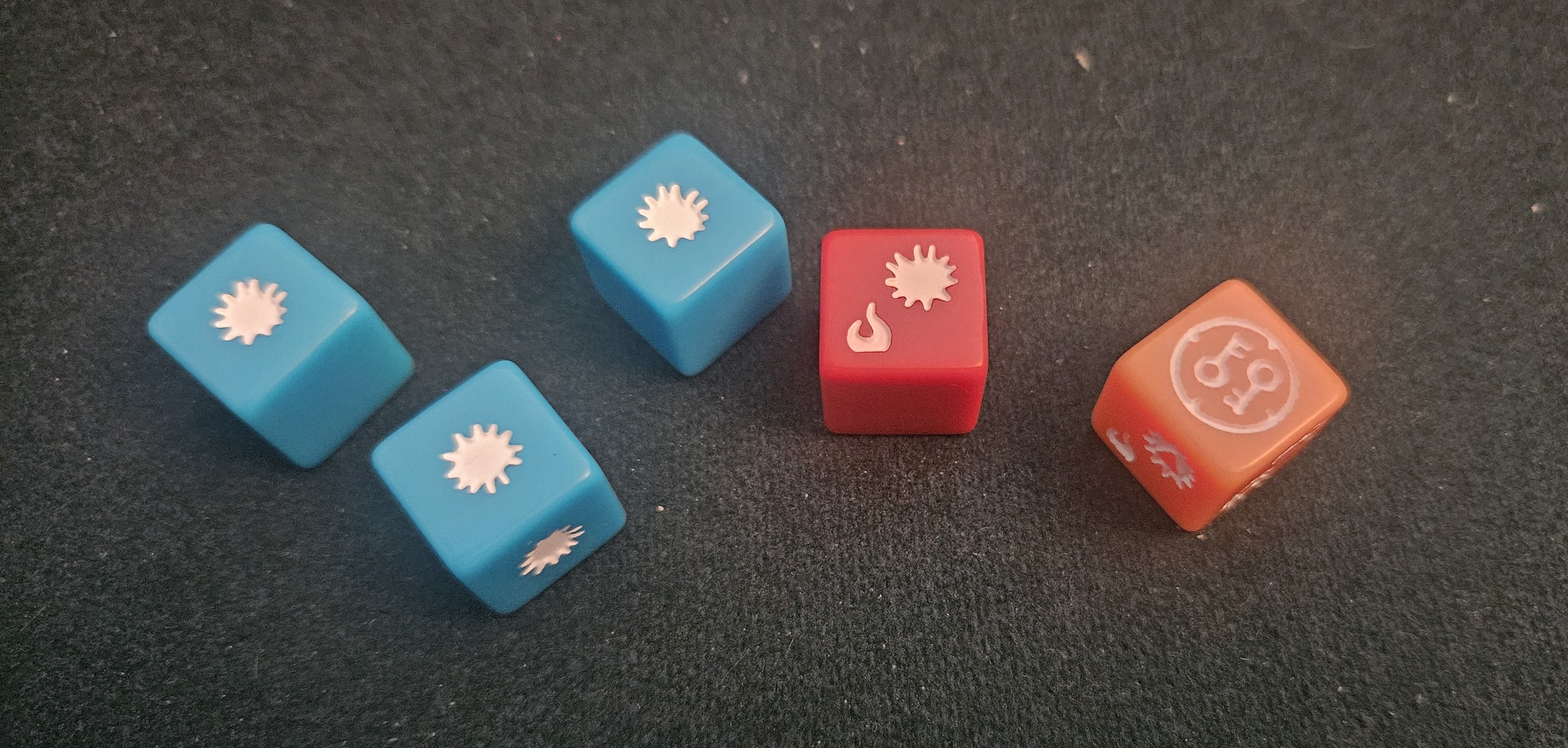 Or there’s combat, one of the finest and fastest ways to resolve a battle that I’ve seen in a board game. The gist is that you roll dice equal to your attacking vessels. Which dice you choose, however, is a big deal. There are three types, each with their own perils. Skirmish dice inflict damage. Easy. Except they also tend to miss, resulting in big flubbed rolls that leave your target warmed up for a broadside of their own. Assault dice are more effective, but sometimes return damage to your own fleet. The most dynamic of the trio are raid dice. These puppies might allow you to swipe resources or even guild cards from your target. They’re also the most dangerous to roll, both injuring your ships and potentially inflicting collateral damage on the opposing city below — a decidedly negative thing, stripping your tableau of any resources or cards that match that planet type.