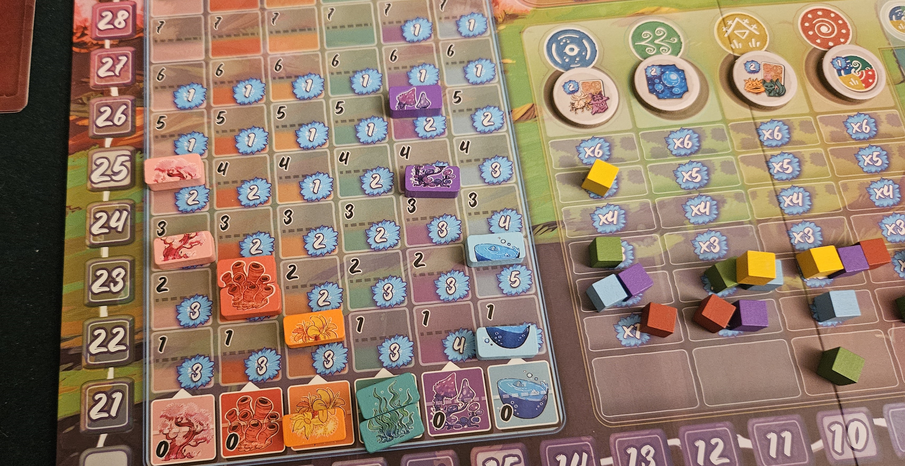 To be fair, that good stuff is captivating. Take, for example, the game’s resources. There are six of the things, biomes that will heal the land. Coral, forests, flowers, that sort of thing, with life-giving water functioning as the rarest of the bunch and filling in when the others are in short supply. Moving up one of these tracks increases its availability for everyone at the table; anything you don’t spend is awarded as points when your turn ends. The inverse is also true. Inevitably, your plans will be upended when somebody spends that patch of fungus out from under you.