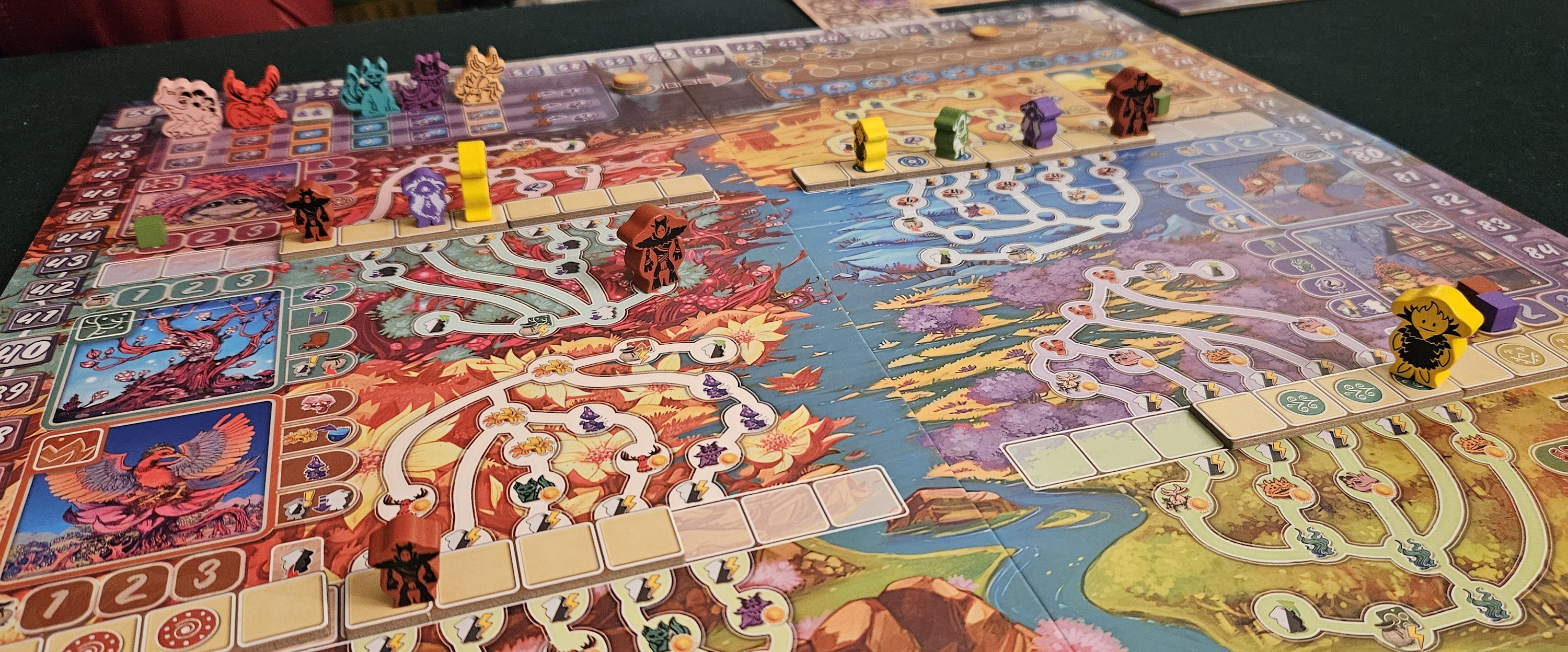 There are four of the things, each attached to two separate pilgrimage trails, interwoven paths that resemble roots or nervous fasciculi. These tracks are cardboard boardwalks, narrow strips that tick forward space by space until they deposit those pilgrims at their desired trailhead. From there, pilgrims trace a route back home, stopping at each icon in turn to gather — everything. Resources, which can be spent by anyone, but which also have a tendency to dry up at the most inopportune moment. Spirit, your own personal measure of how often you can deploy an extra pilgrim or push one of those routes forward an extra space. Extra villagers, trained and sent out into the world. Cards. Creatures. Favors with the local patron guardians.