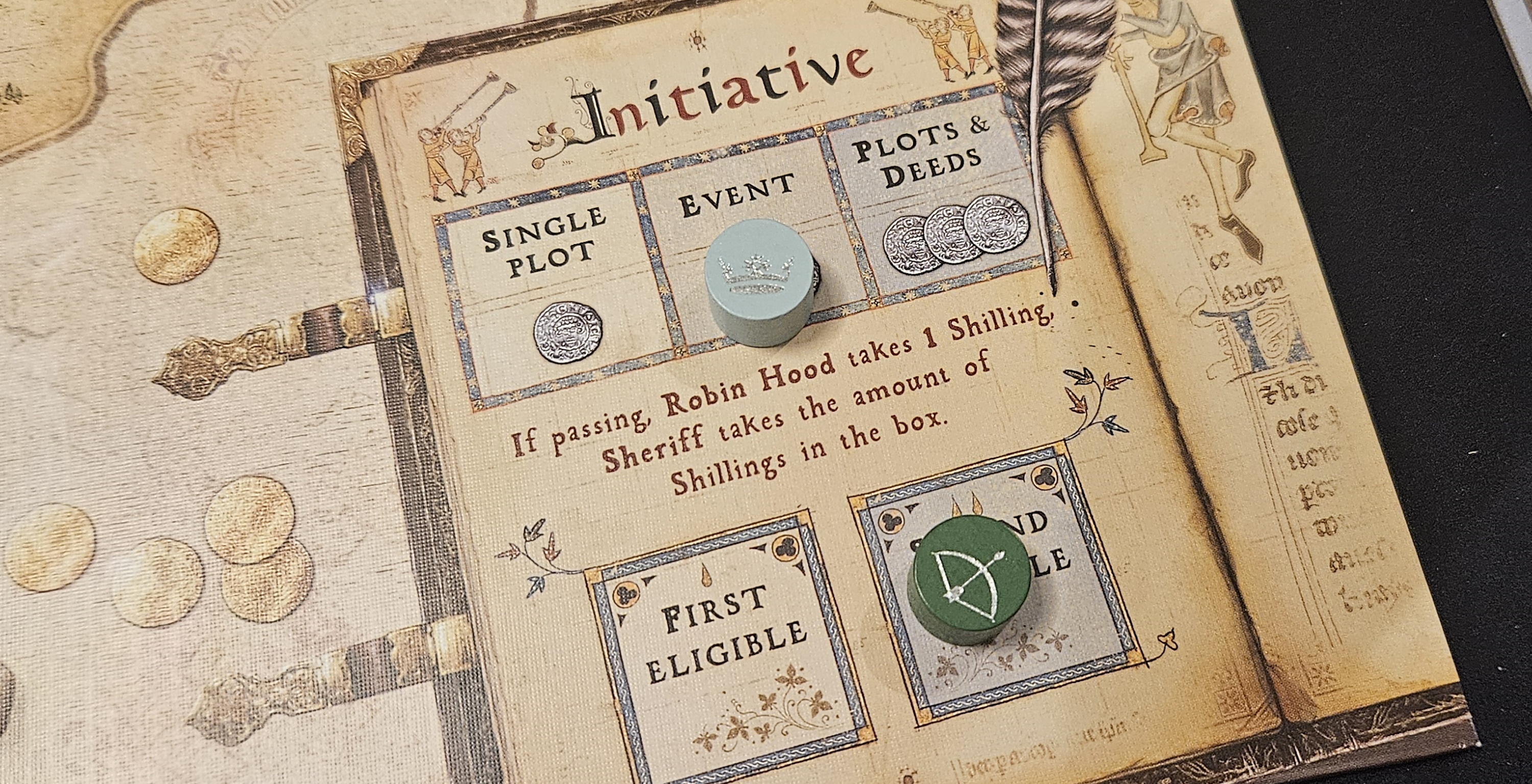 Foremost among those identities is the game’s location in the COIN Series. It’s a mouthful that defies digestion, staying on the plate while the others go down. In a year dominated by easy access points to Volko Ruhnke’s now-storied system, with People Power and The British Way and Vijayanagara already on the line, A Gest for Robin Hood offers the gentlest entry of them all. Everything has been streamlined to a fine surface. The artwork is inviting. The operations and special activities, dubbed “plots” and “deeds,” have been trimmed. The duration is around forty-five minutes rather than two to five hours. The deck has been tightened so that every card matters. The rulebook… well, the rulebook is still written in GMT’s signature style, with all the verve of a furniture assembly manual. But there’s a learn-to-play booklet that walks players through a full ballad, the game’s epithet for a round, and the diminished complexity goes a long way toward defanging the usual bite of learning one of these things.