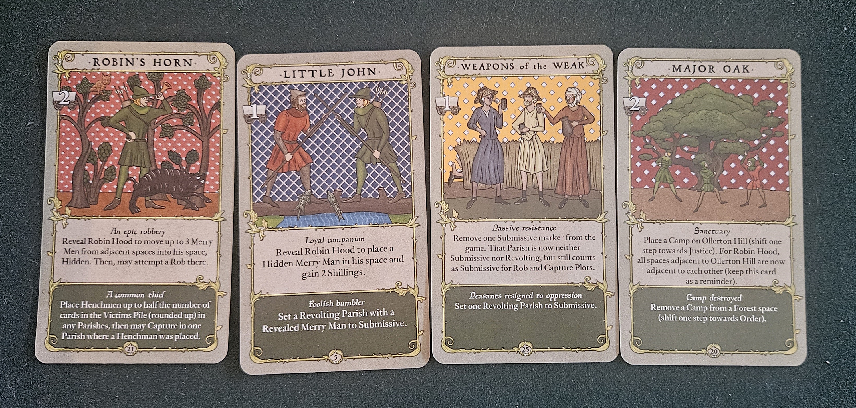 I’m always wary of putting too much stock in balance. I have no doubt that some players will have inverse experiences to those that marked my sessions. Rather, my concerns have more to do with mouthfeel. A Gest of Robin Hood is chock-full of exciting morsels. Robbing a carriage. Turning a region against the Sheriff. Creeping into Nottingham to crack the treasury. One event lets a parish weaponize work stoppages and “peasant ignorance” to effectively opt them out of the game. Wonderful! What a perfect expression of the ways oppressed groups have historically warred with their overlords!