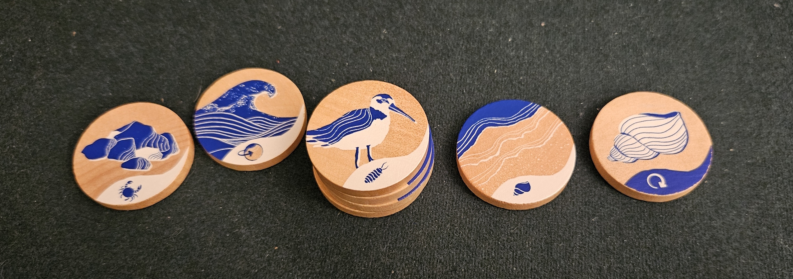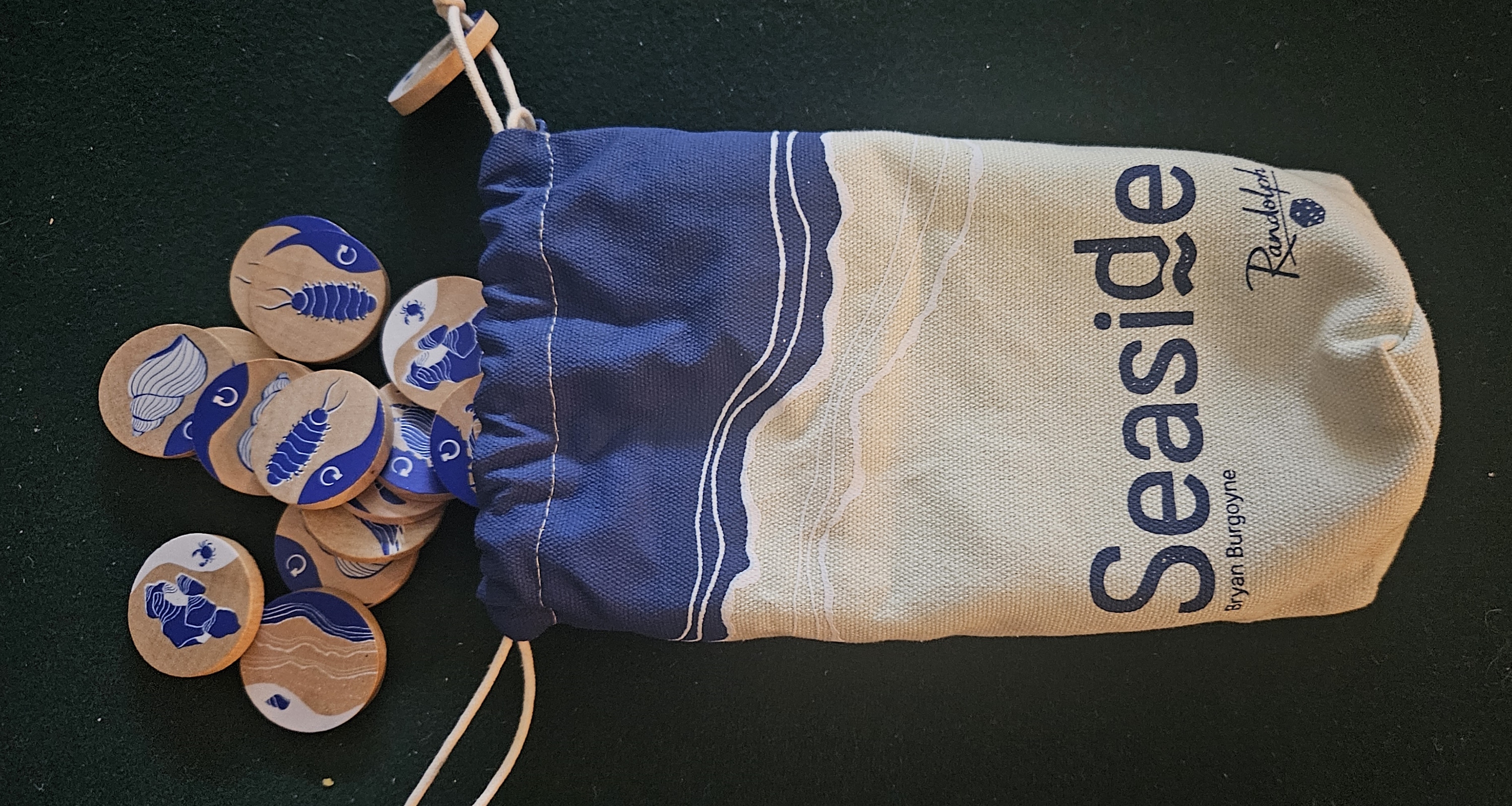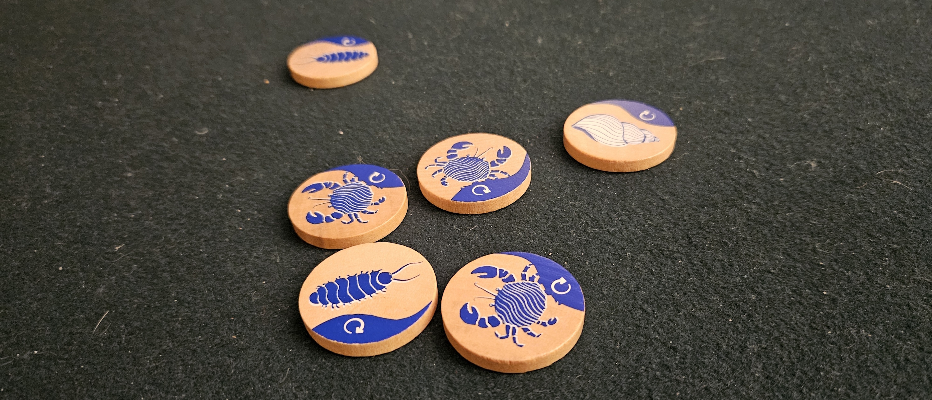 Even those specifics don’t add much to the description. There are seven faces in all. Three of them are more or less identical. Should you draw and choose a crab, an isopod, or a seashell, you toss the token into the sea and then pull from the bag again. Breezy.