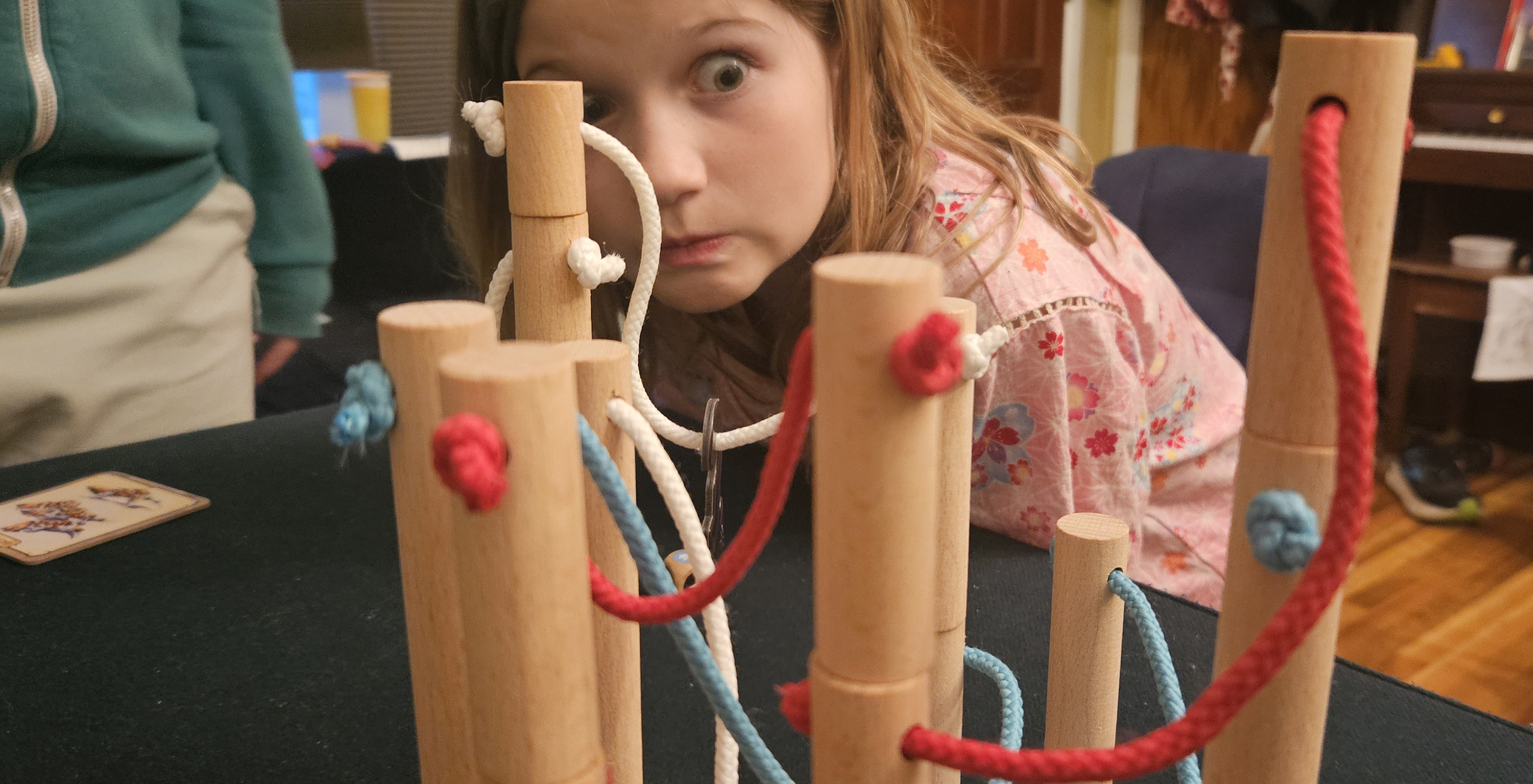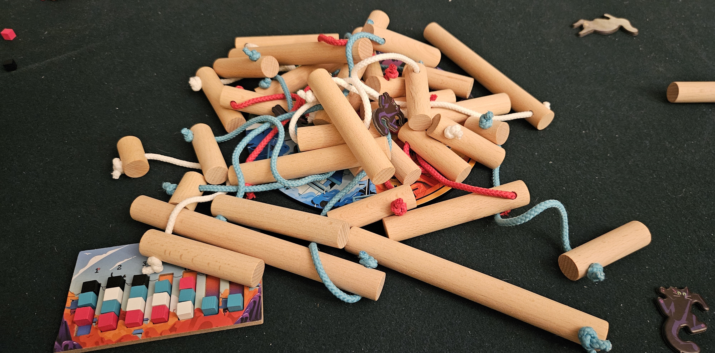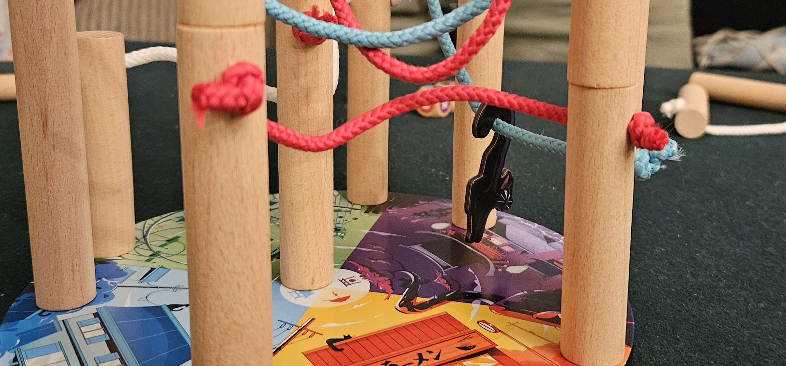 There are also cats. Mixed into the draw-bag are black cubes; when drawn, players are tasked with suspending a cat from one of those suspended cables.