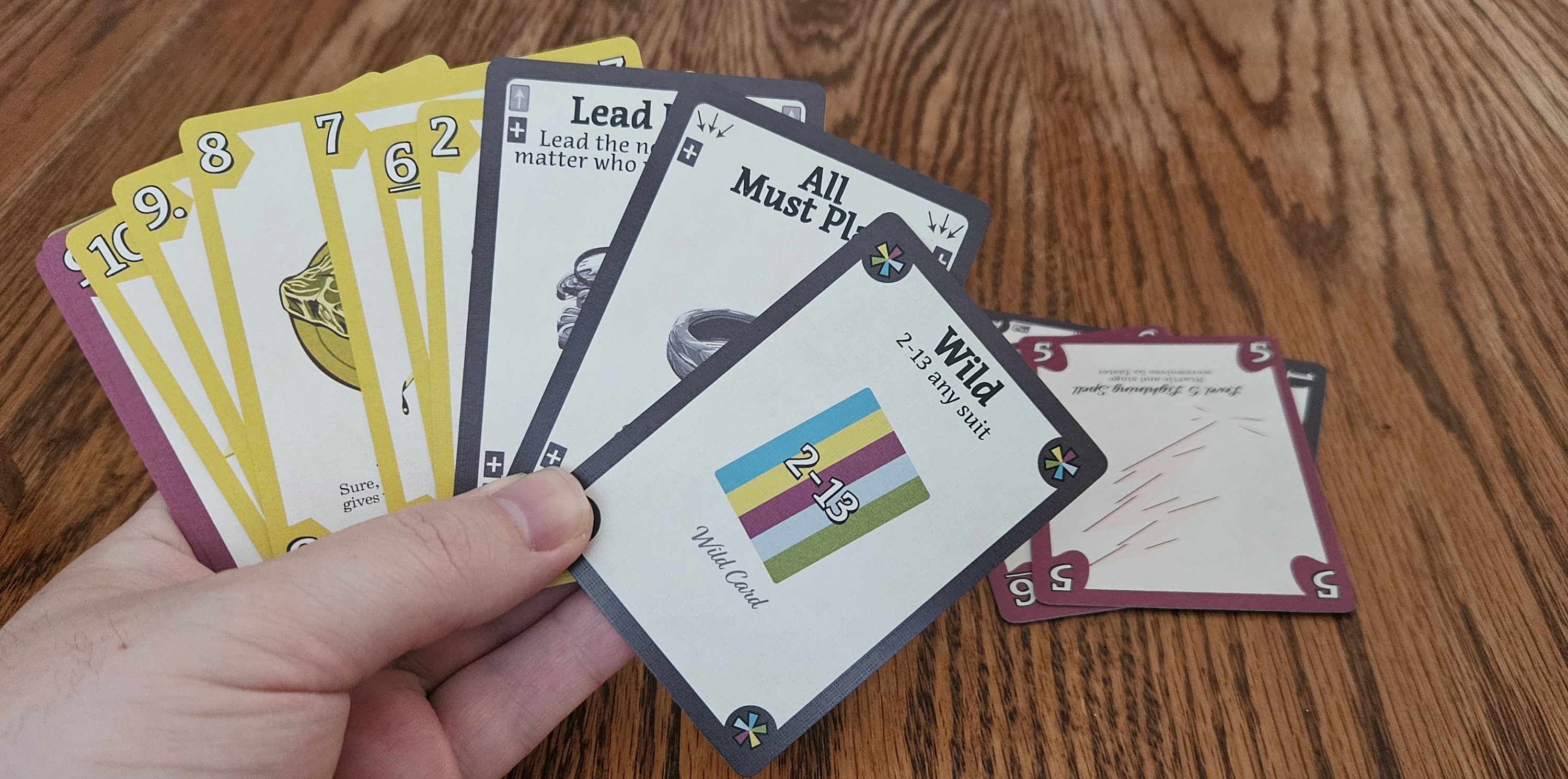 Which brings us to Seers Catalog’s unusual scoring system. Unlike SCOUT, you aren’t trying to drop your hand to zero. Oh no. What’s the point of reading a mail-order catalog without treating yourself to something? Here your objective is to have a small hand, five cards or fewer. The instant you hit that threshold, you flip your bonus token. This indicates that you’ll score your lowest card when the round ends. That’s the only way to score positive points, by the way. But it also forces you to play into any future tricks. No more holding back. The instant somebody goes out, the round ends and everybody loses one point per card.