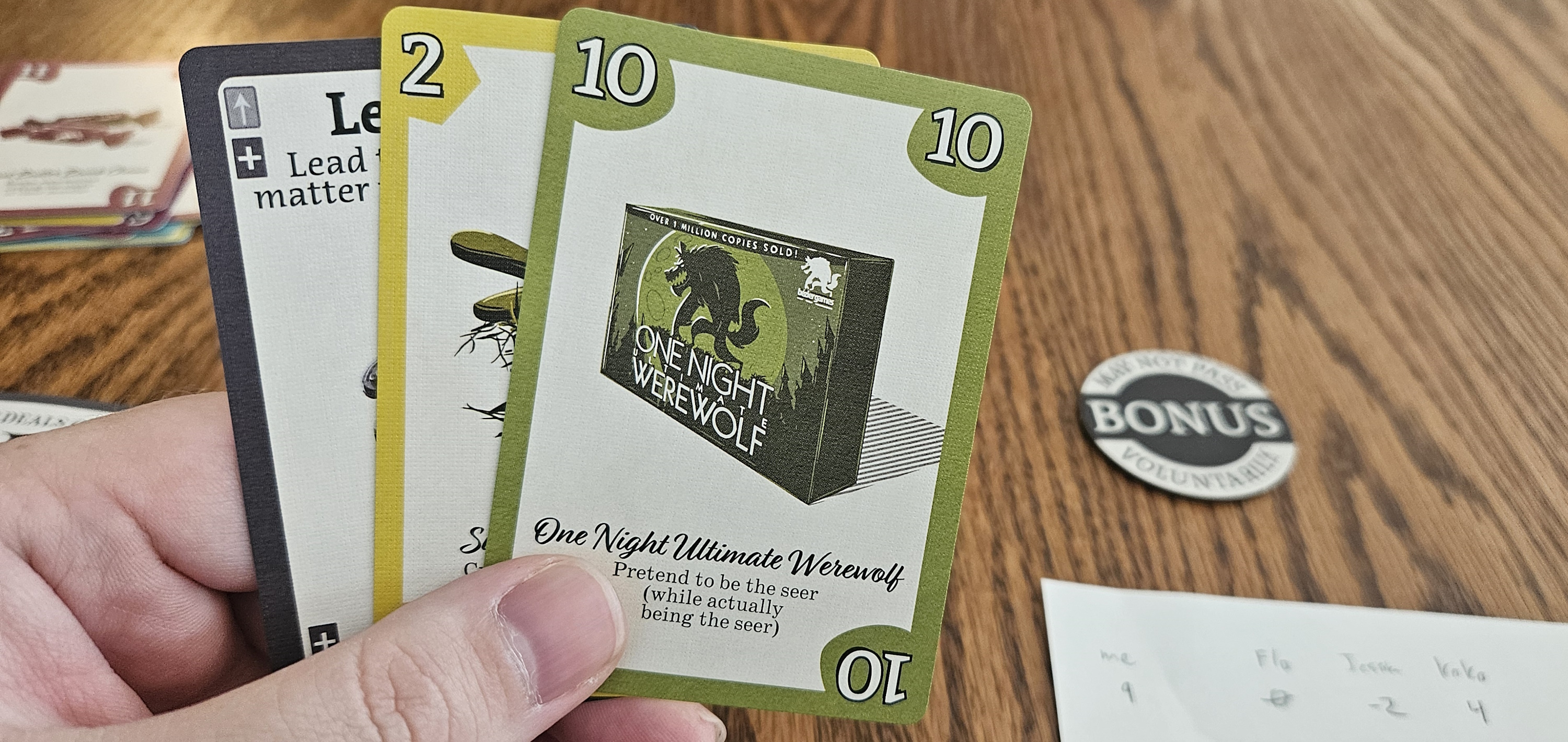 In other words, it’s entirely normal to go into debt. Point debt. Thematically, real debt. You want to have a trim hand, but that way lies the danger of being forced out of the round too early. Except, of course, sometimes that’s a good thing. Better to score zero points than negative seven.