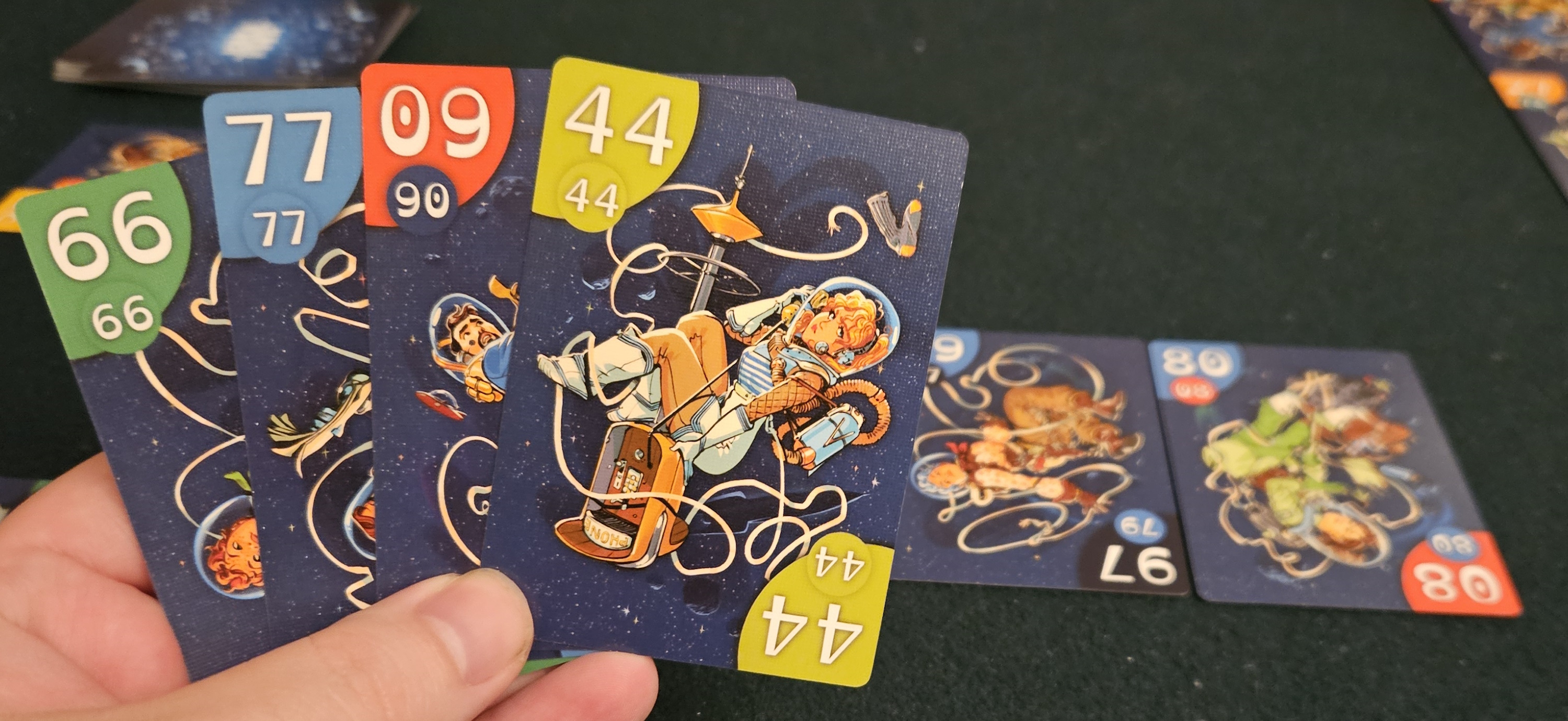 Now for the tricky part. Both players — or both teams, if partnering up is more your speed — operate from their own perspective. On one side of the table, consecutive numbers are counted from left to right. On the other, they’re counted from bottom to top. As these numbers are linked , the table fills with multiple clusters of astronauts, each knotted together by consecutive digits. These clusters can also be merged, provided you can find the proper cards to bridge the gaps between them.